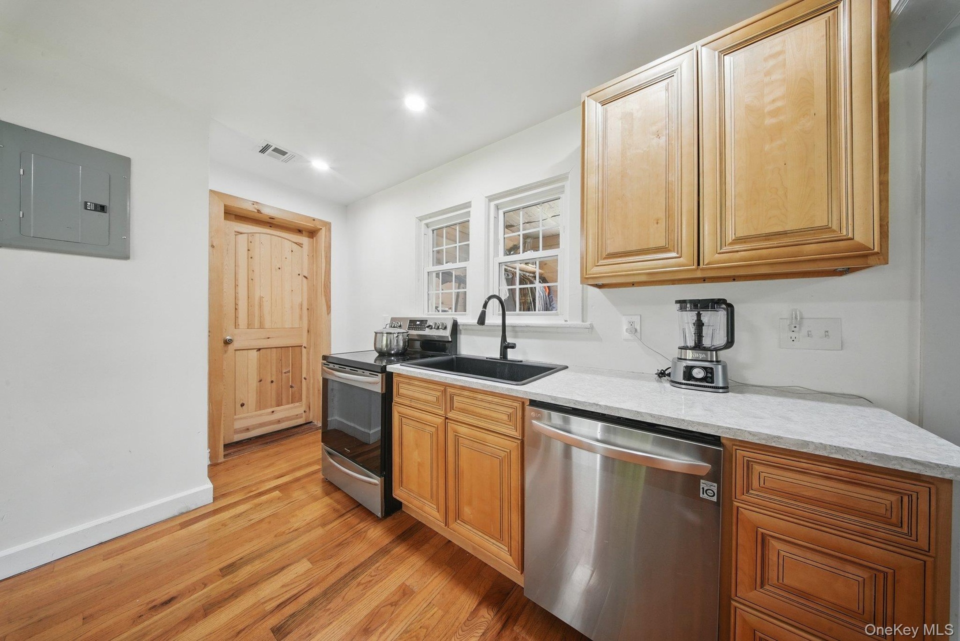- Kitchen with appliances with stainless steel finishes, electric panel, a sink, light wood finished floors, and baseboards