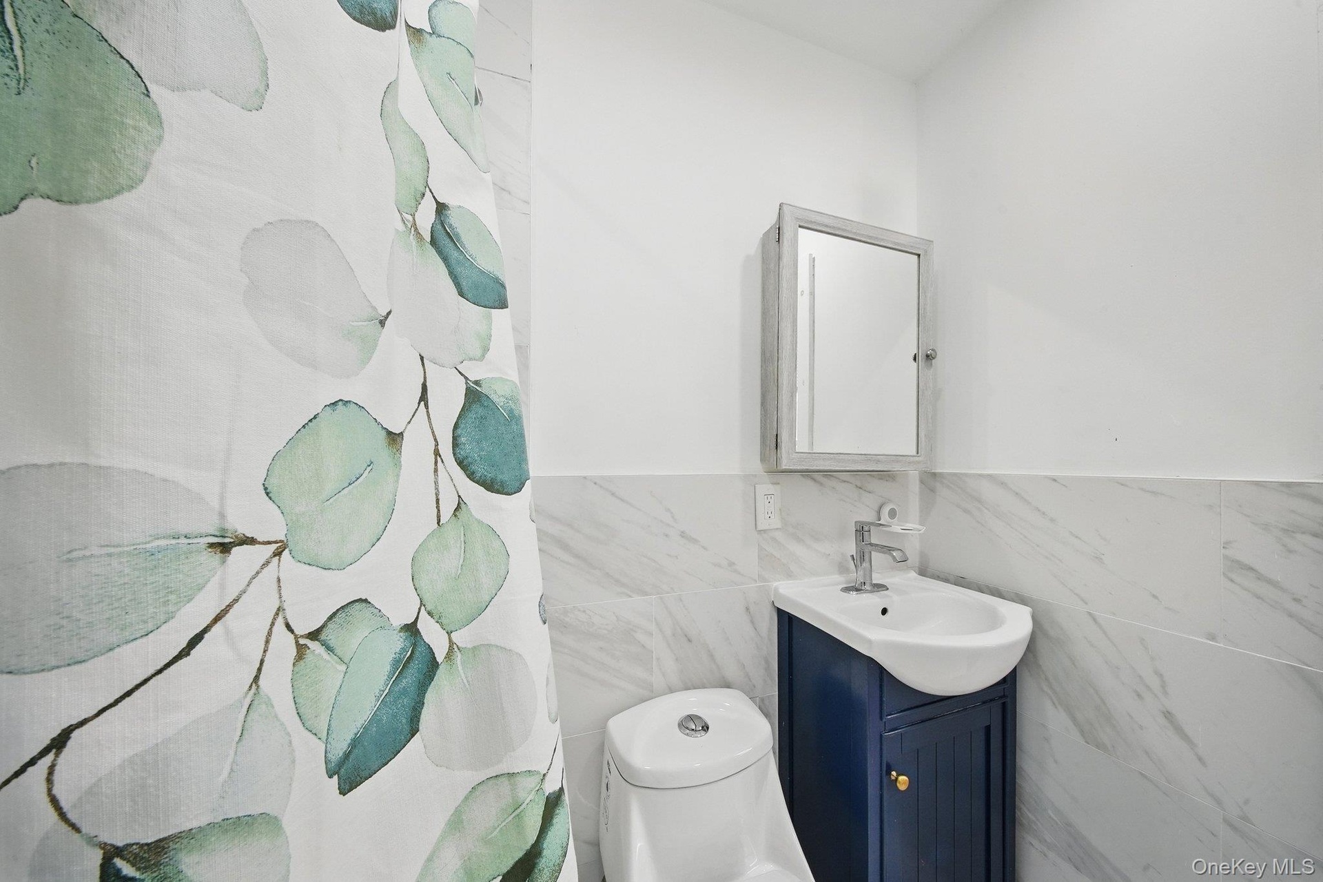 - Bathroom featuring tile walls, vanity, a wainscoted wall, and toilet