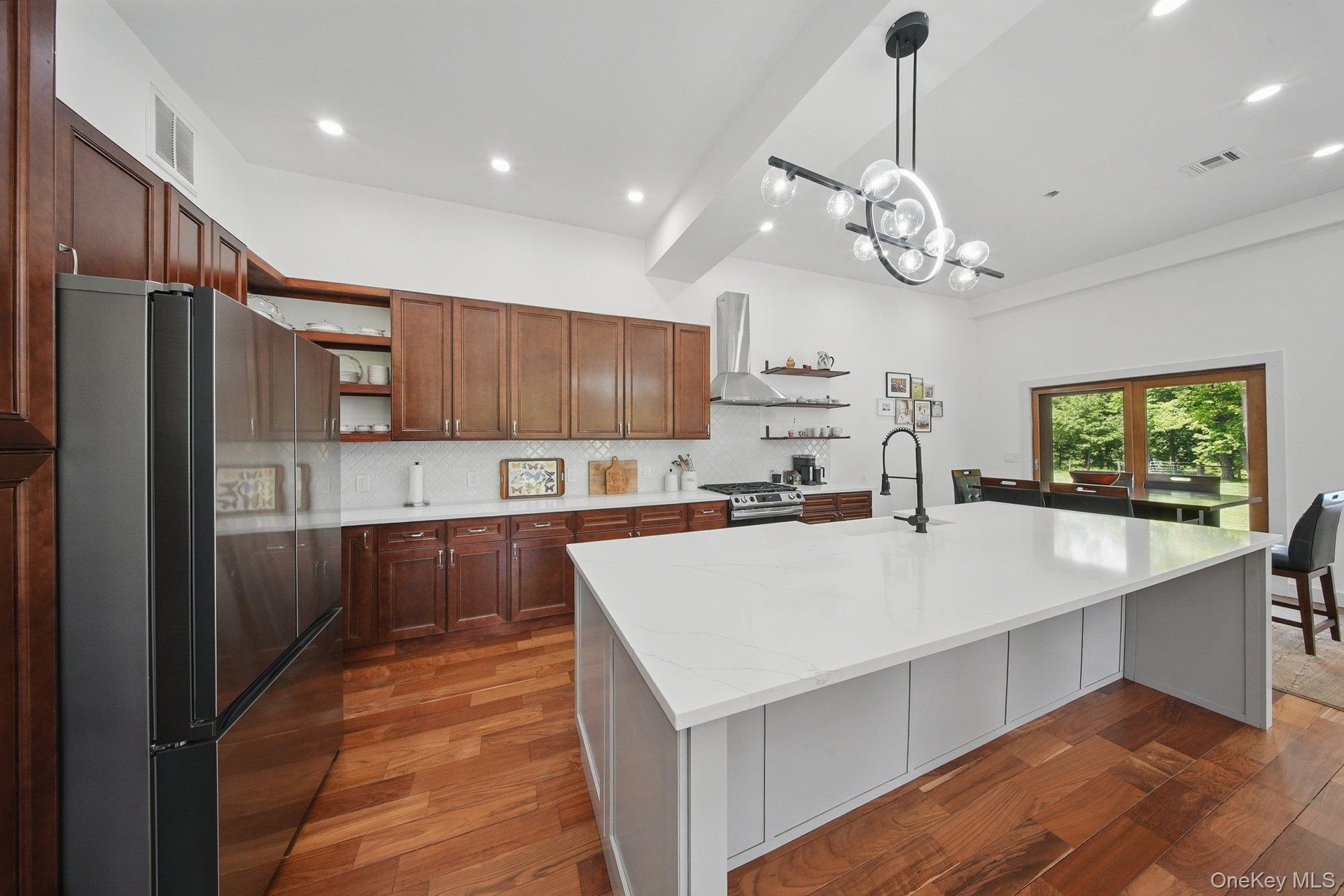 - Kitchen featuring appliances with stainless steel finishes, open shelves, wall chimney exhaust hood, backsplash, and hanging light fixtures