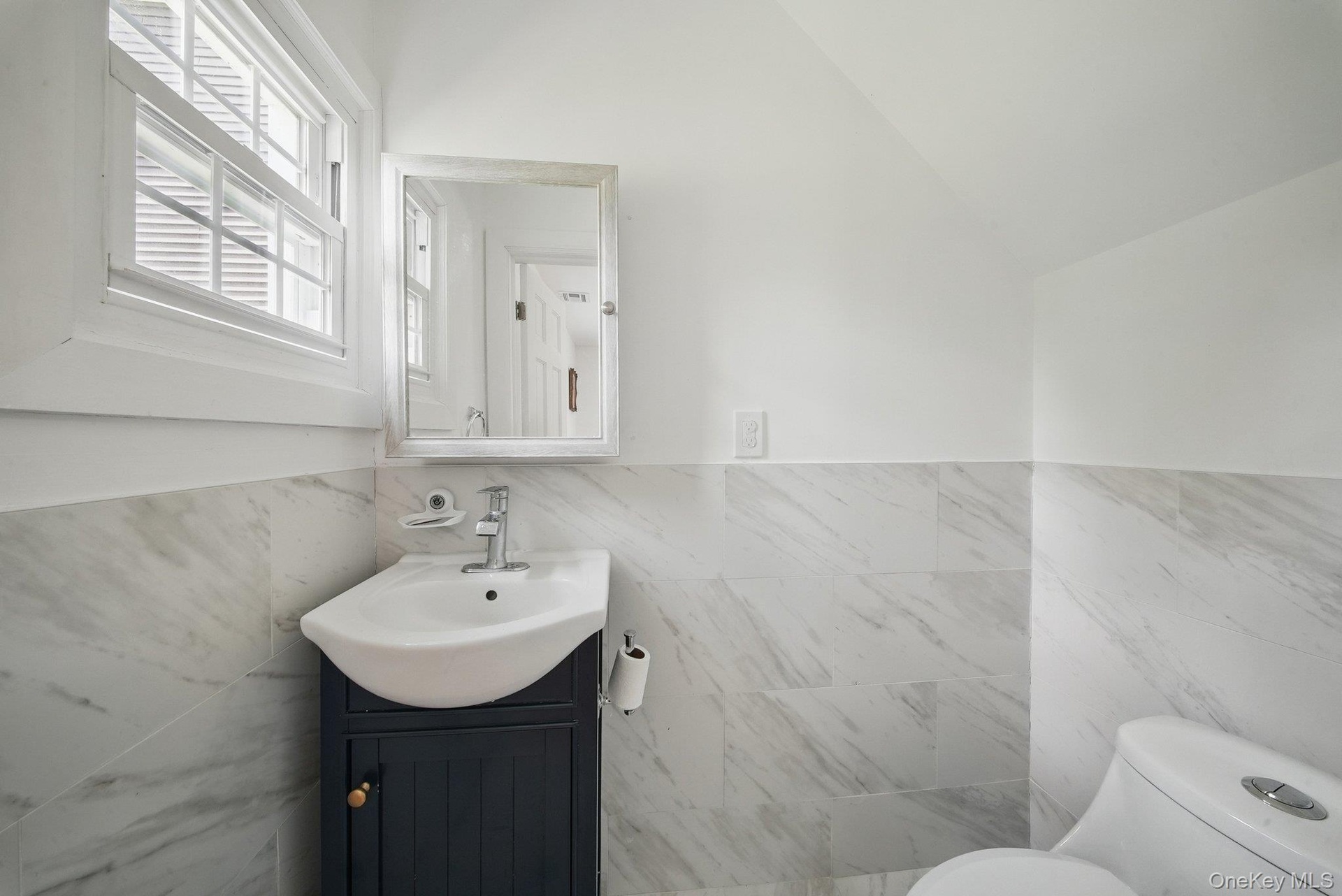 - Bathroom with tile walls, lofted ceiling, toilet, vanity, and a wainscoted wall