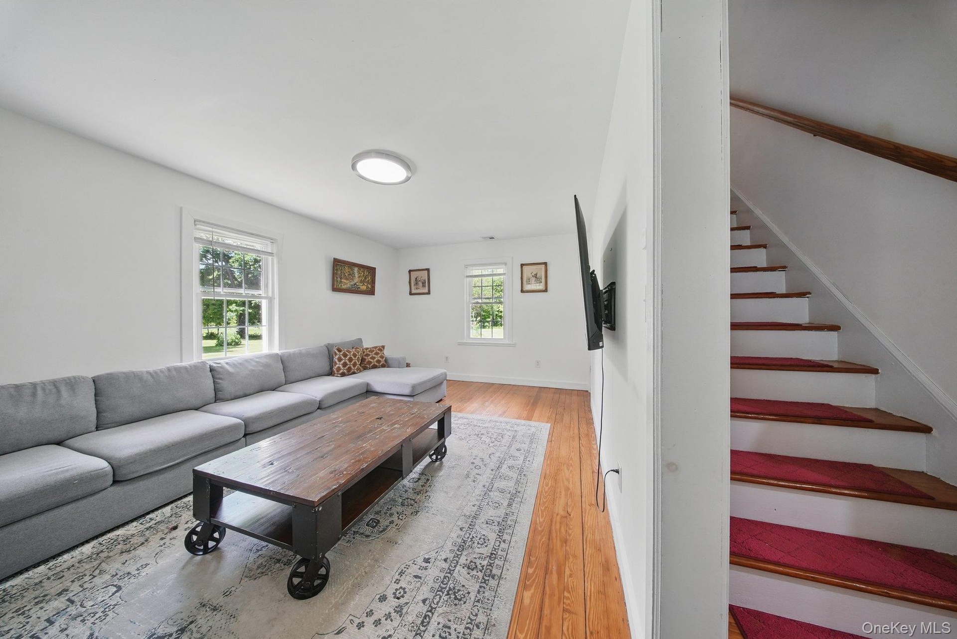 - Living room featuring stairway, light wood-type flooring, and baseboards