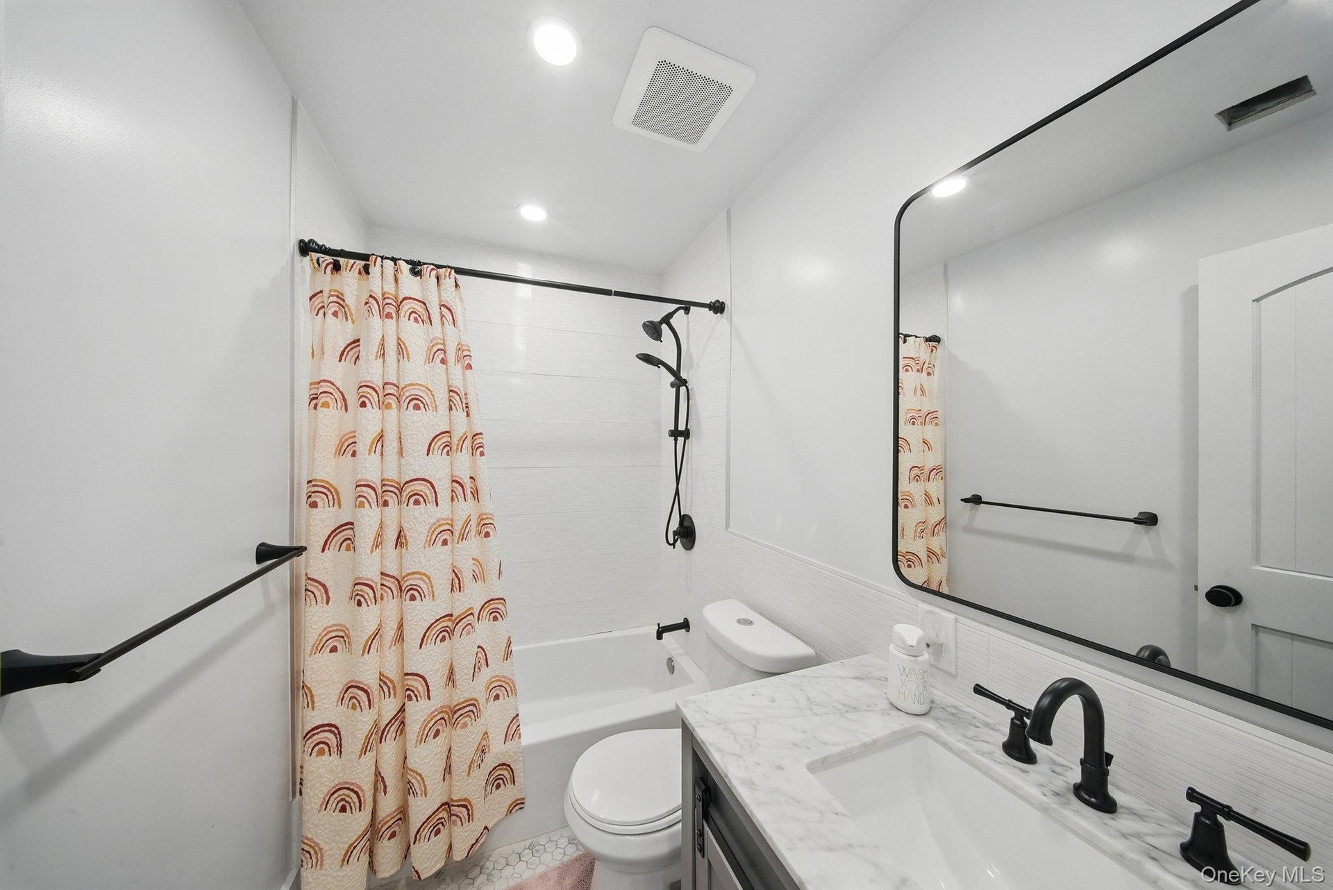 - Bathroom with toilet, recessed lighting, shower / bath combination with curtain, and vanity