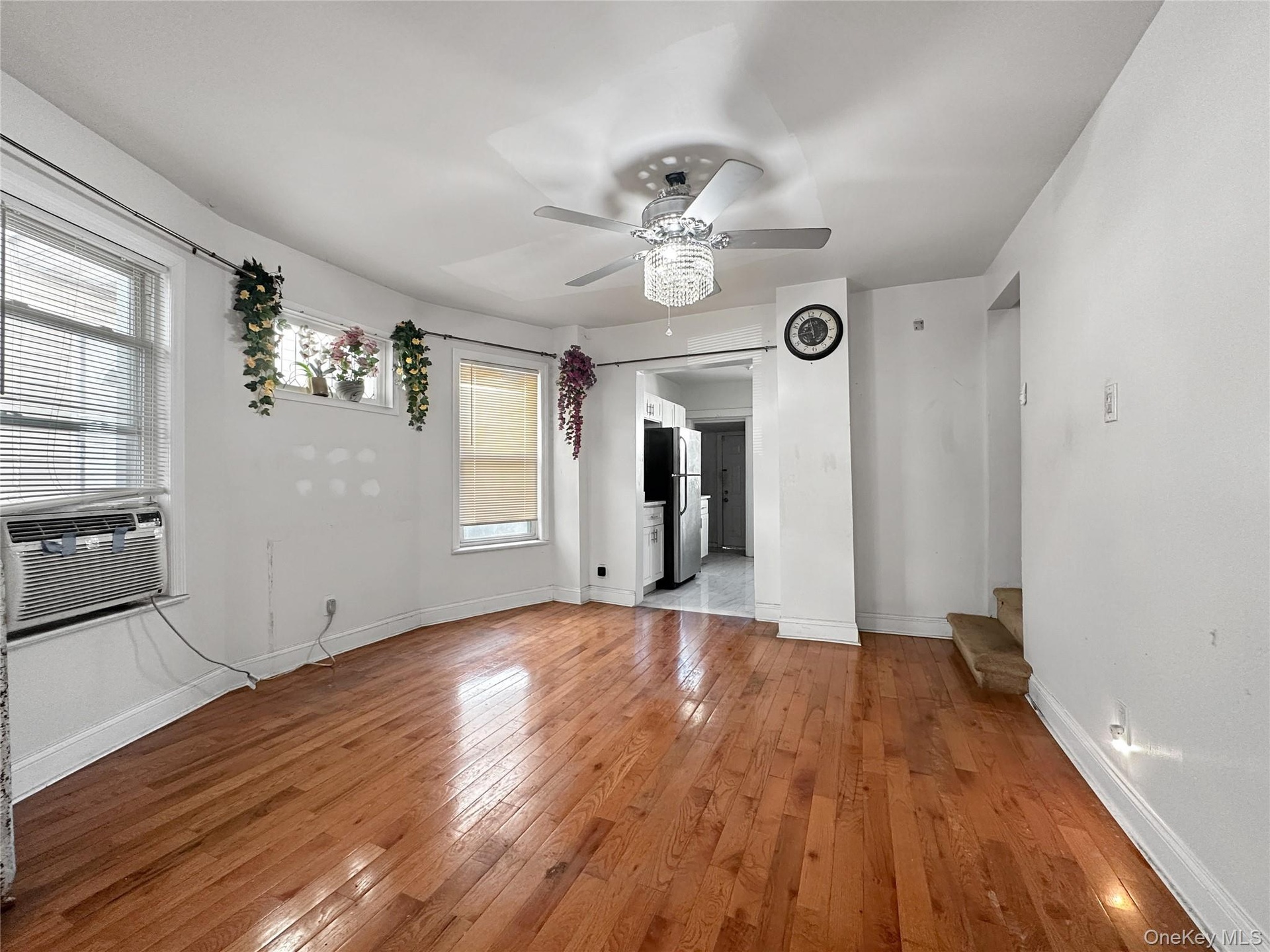 - Unfurnished living room featuring hardwood / wood-style floors, a ceiling fan, stairs, and cooling unit