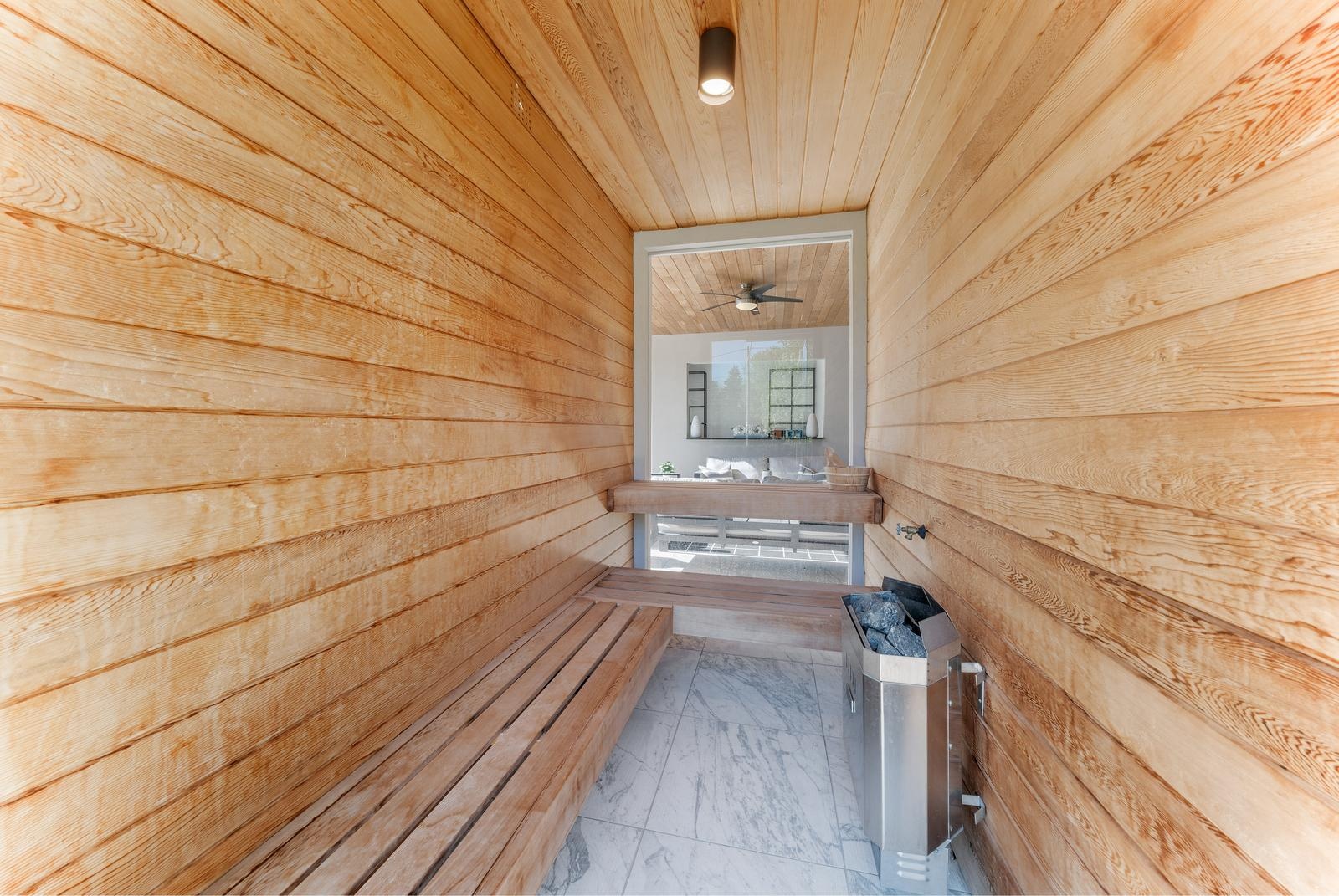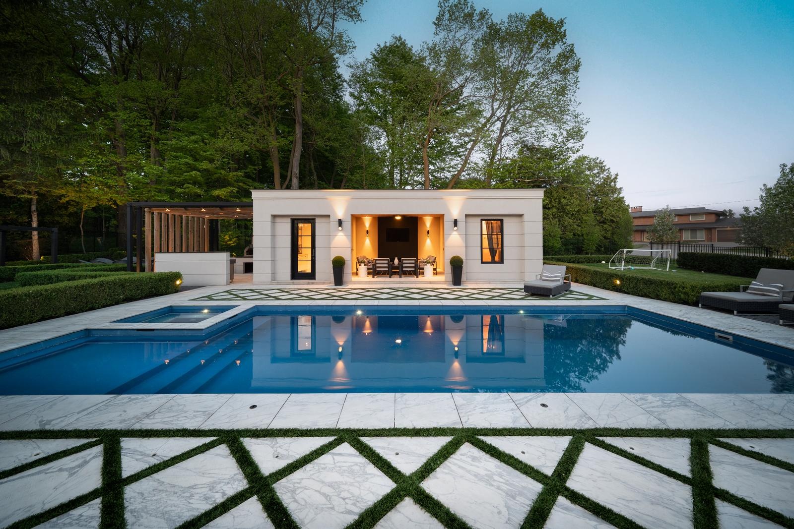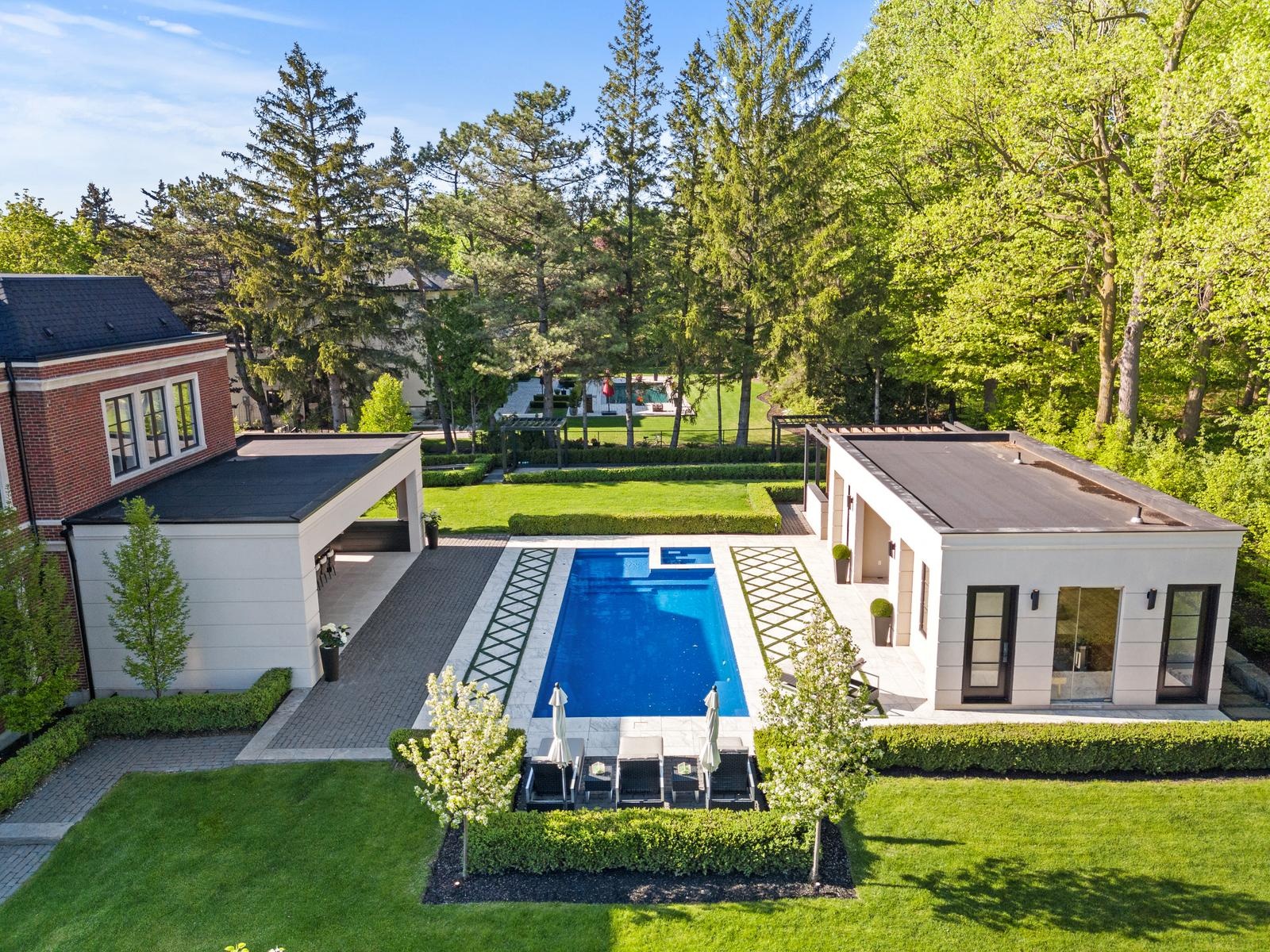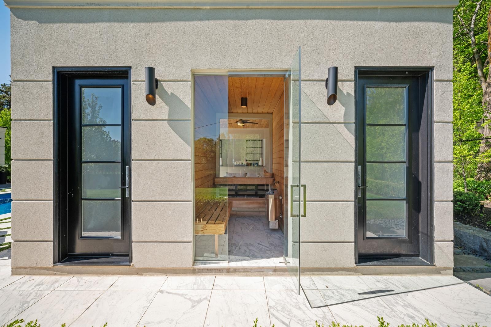 Step outside and experience resort-style living year-round: a covered alfresco dining lounge, two outdoor kitchens, two gas fireplaces, a cabana lounge with a full bar, second kitchen, built-in wood-burning pizza oven, poolside ensuite with shower, and your own steam sauna. This is the kind of backyard you’ll never want to leave.