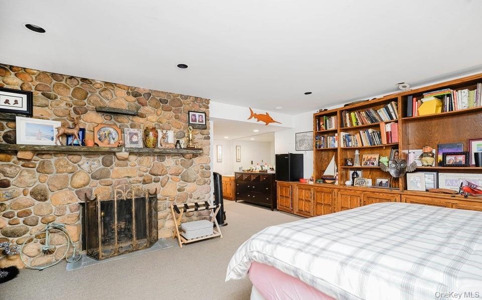 - Living room with a stone fireplace, carpet, and recessed lighting