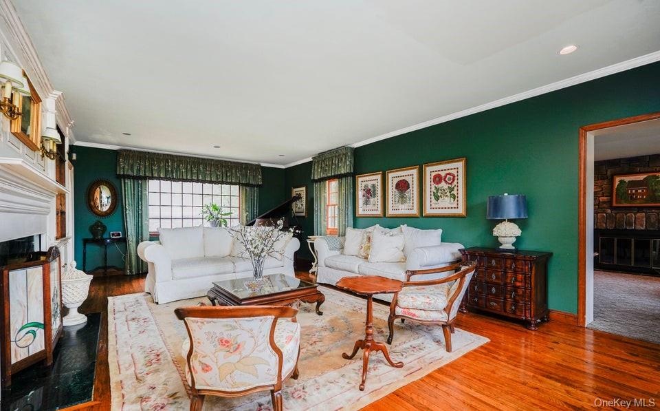 - Living room with wood finished floors, ornamental molding, a high end fireplace, recessed lighting, and baseboards