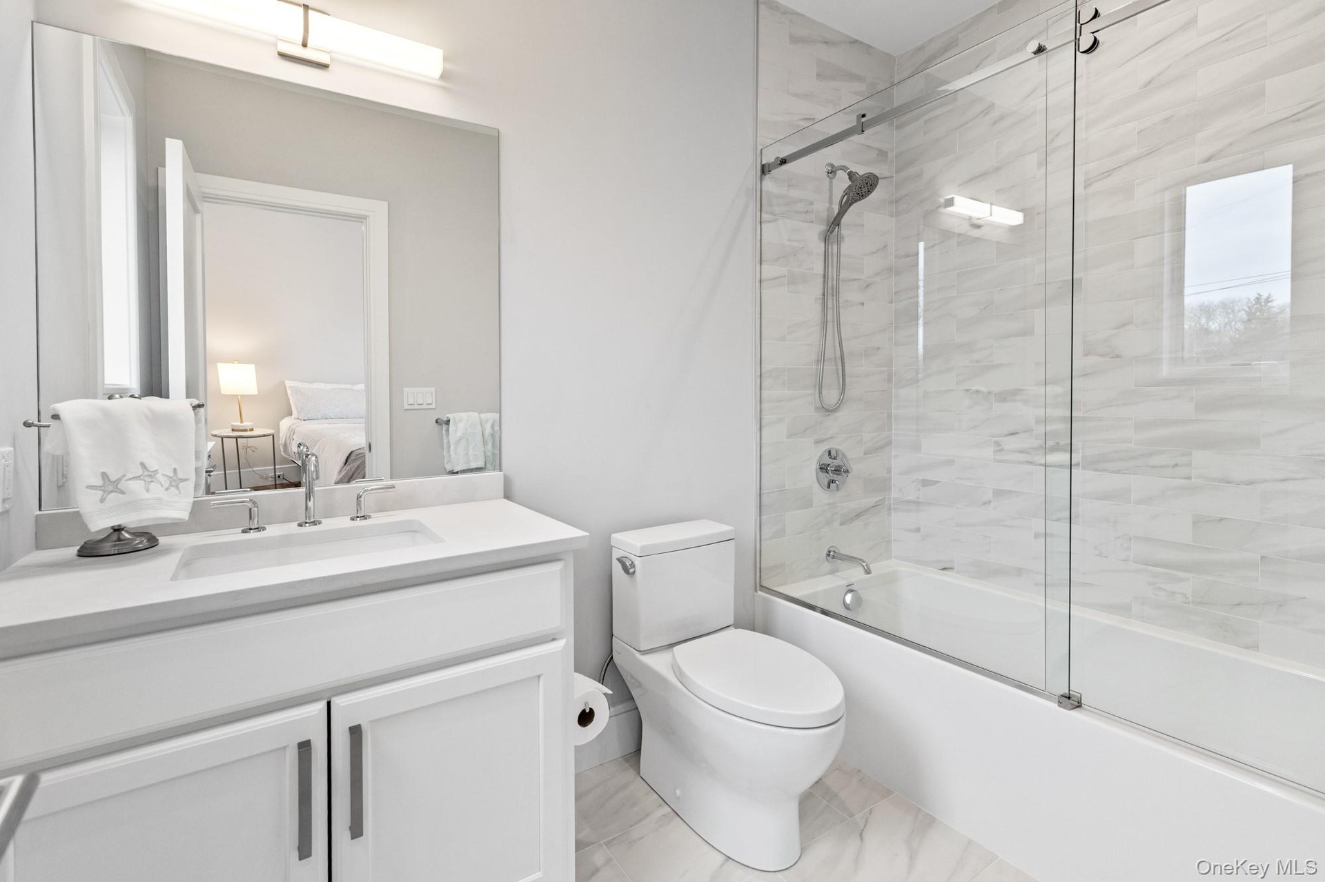 - Ensuite bathroom with bath / shower combo with glass door, vanity, toilet, and marble look tiles