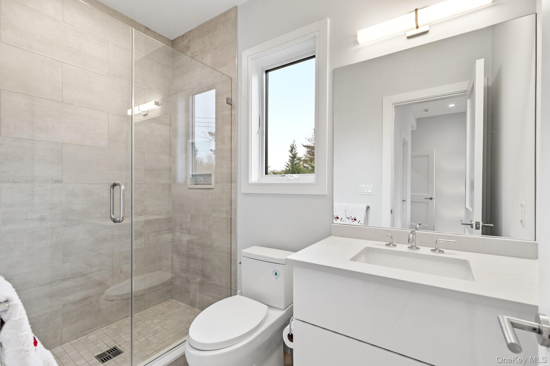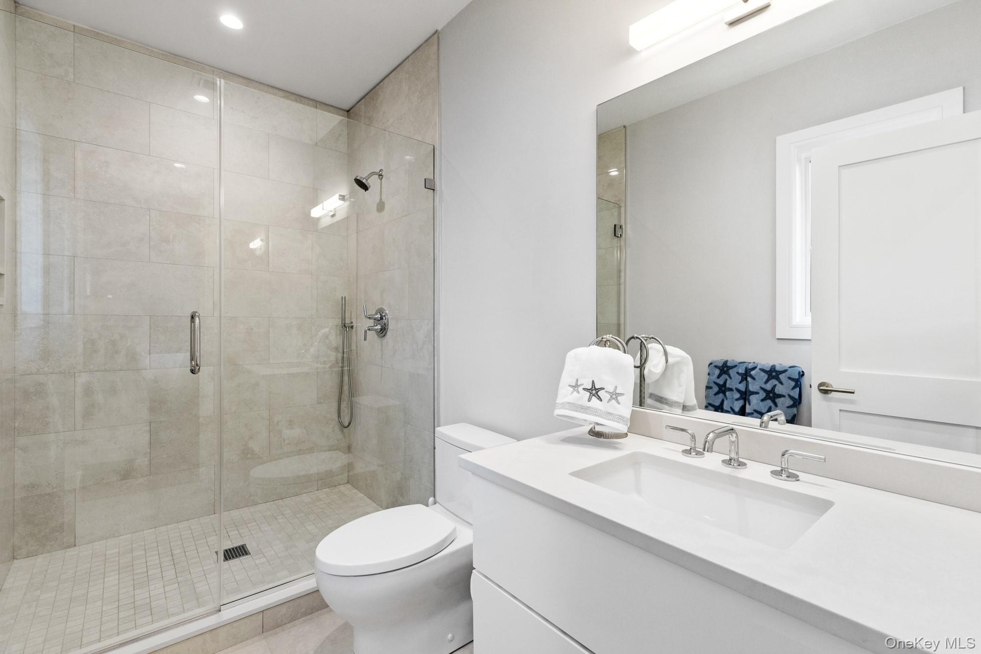 - Bathroom with vanity, toilet, an enclosed shower, and recessed lighting