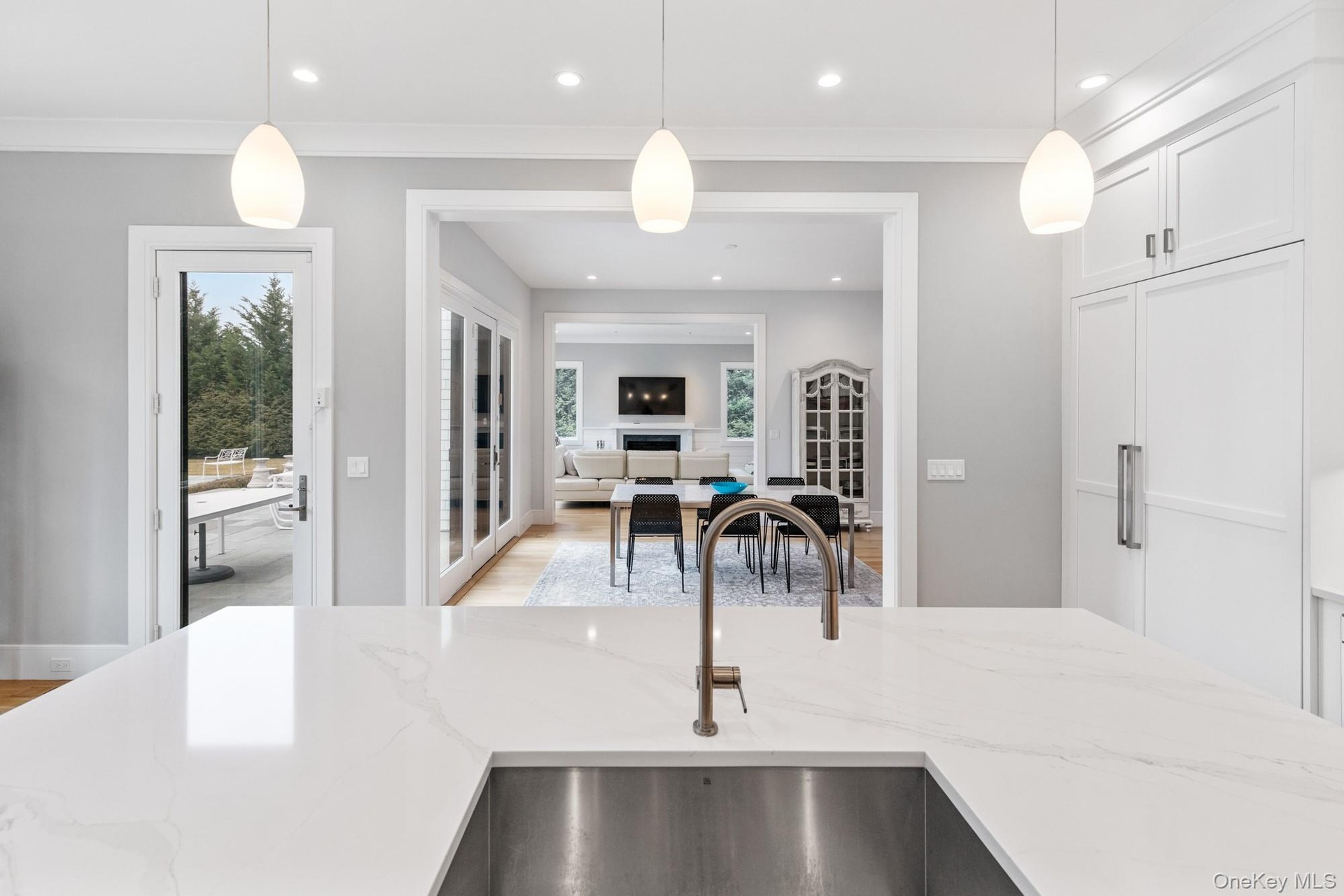 This stunning Modern Farmhouse, built in 2022, is located in prime Water Mill North, off of Head of Pond Road, across from Mill Pond. There are five king-sized bedrooms, 7 full baths and one half bath. The sun-flooded main floor includes a soaring two-story entrance foyer, high ceilings, state of the art kitchen with breakfast area, Thermador appliances, built-in Thermador wine column, a large walk in pantry and open central dining area. The living room has a masonry fireplace and sliding doors to the south-facing bluestone patio. There is a separate formal dining room with shiplap trim, a spacious first floor primary suite with high ceilings and its own en-suite bathroom, a full sized pool bathroom, a powder room, a spacious mud room, and oversized attached two car garage. Sliding glass doors lead to a large two-level bluestone patio and 20x40 heated gunite pool with water feature. The second floor includes a large primary suite with private balcony overlooking the pool and bluestone patio. Its en-suite bathroom has a floating bathtub, double sinks, radiant heated floors, and oversized walk-in shower. Each additional bedroom is en-suite with its own private bathroom. All closets are custom built and there is a separate bonus room. The partially finished basement includes a full bathroom. There is an additional 1900 square feet of unfinished basement, with high ceilings and four windows that can be easily finished and customized. A large, level driveway from Head of Pond Road leads to the attached garage, bluestone front walkway and stately covered front entrance. Mature landscaping provides complete privacy and an estate-like feeling to the property.