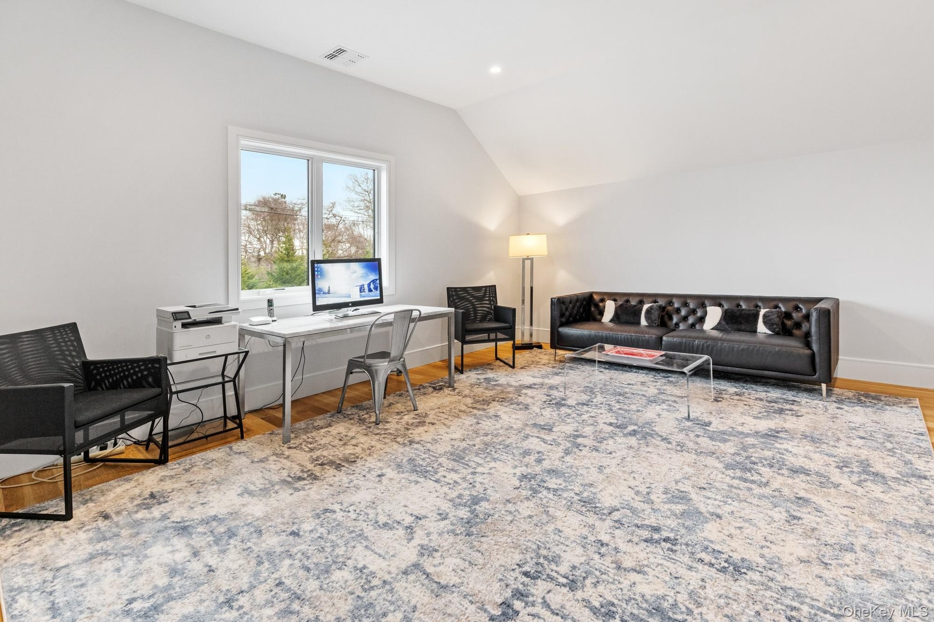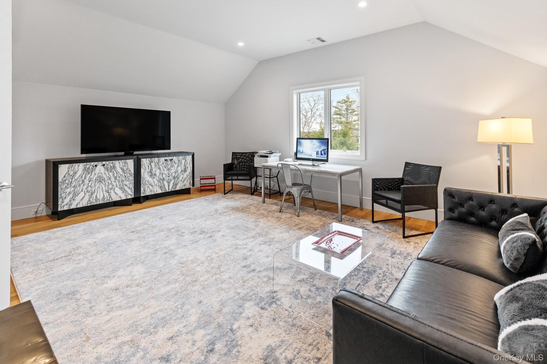 - Living room with lofted ceiling, wood finished floors, recessed lighting, and baseboards