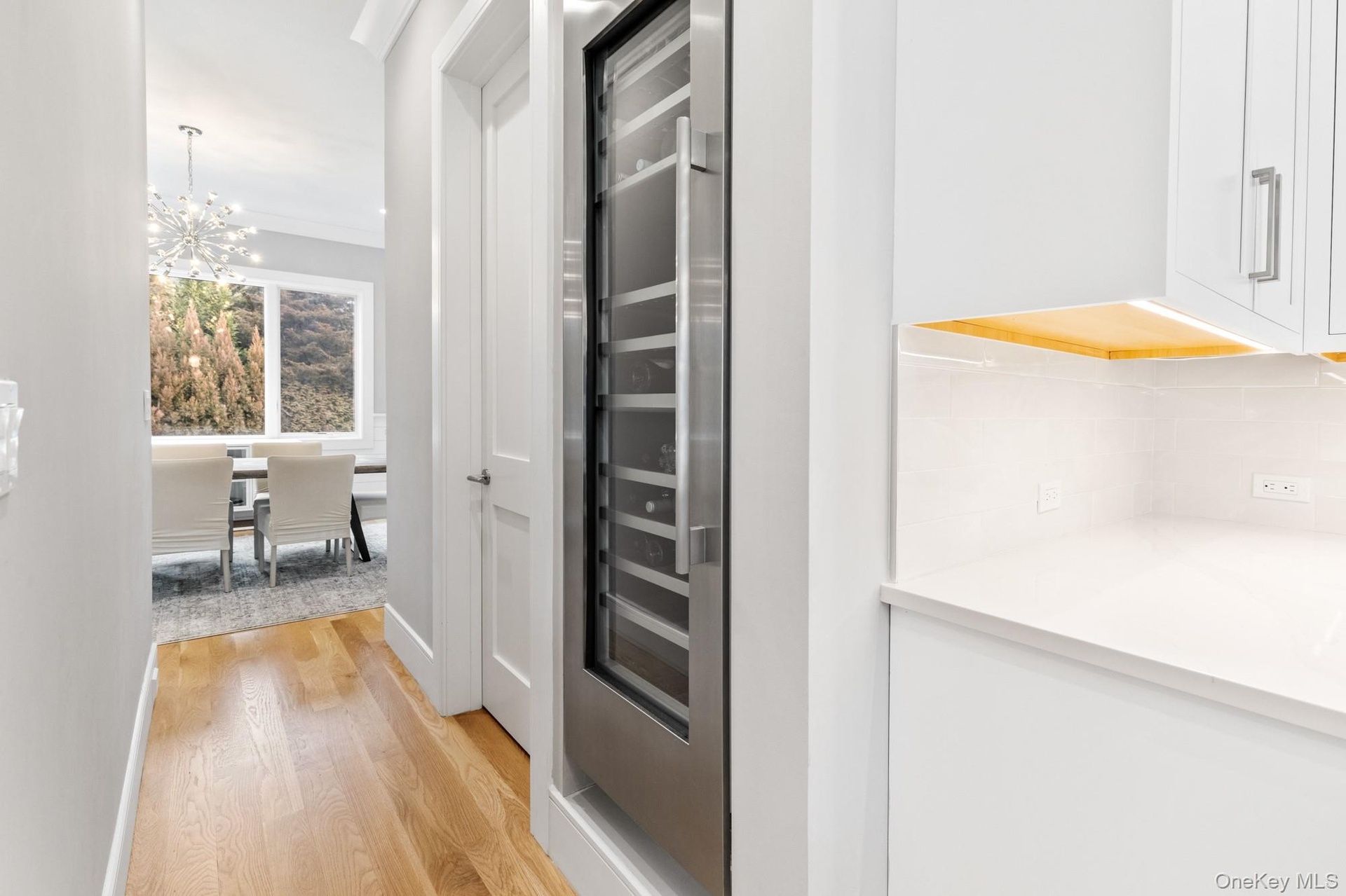 - Hall featuring a chandelier, light wood-type flooring, and beverage cooler