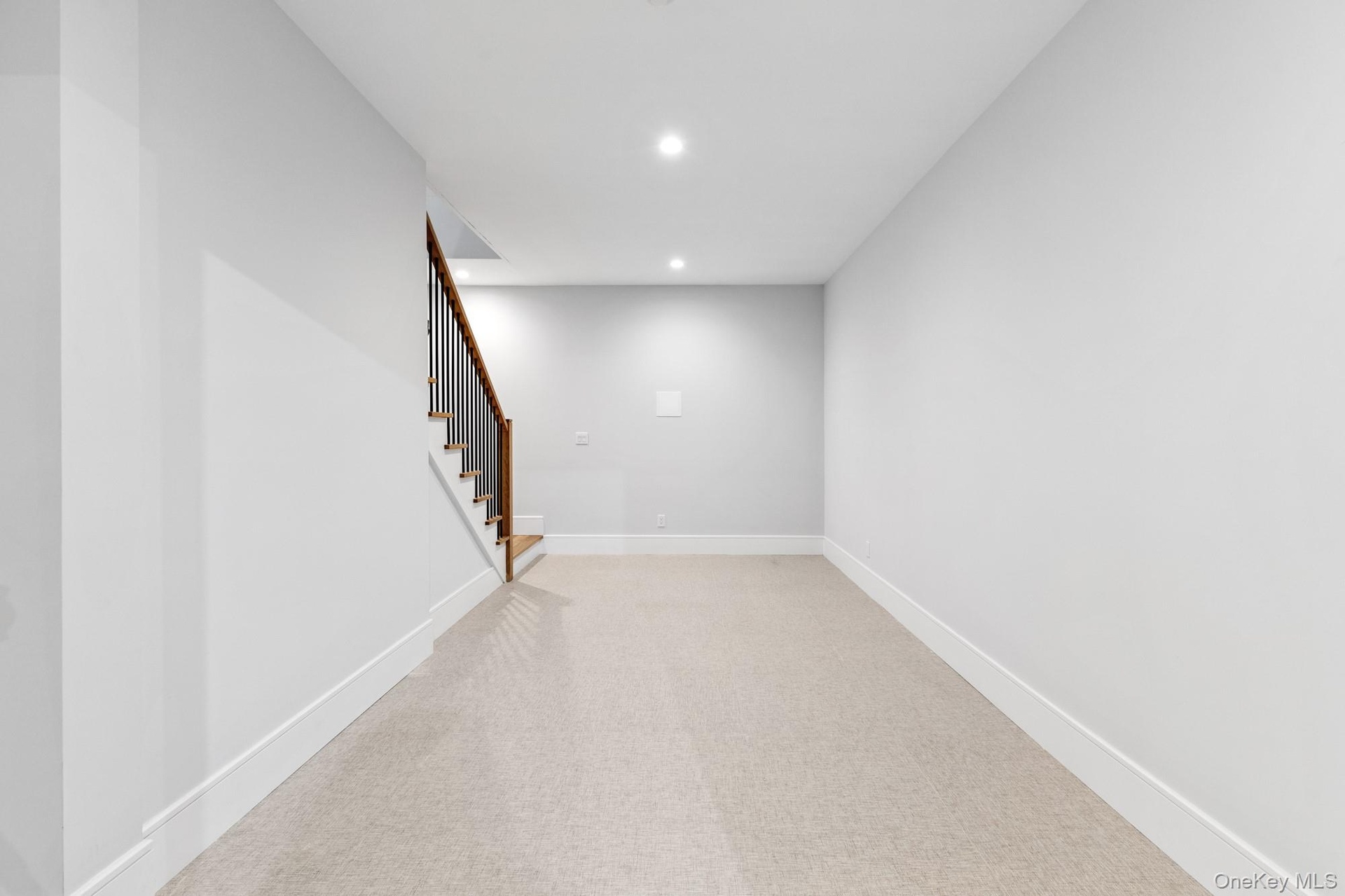 - Finished below grade area with recessed lighting, stairway, light carpet, and baseboards
