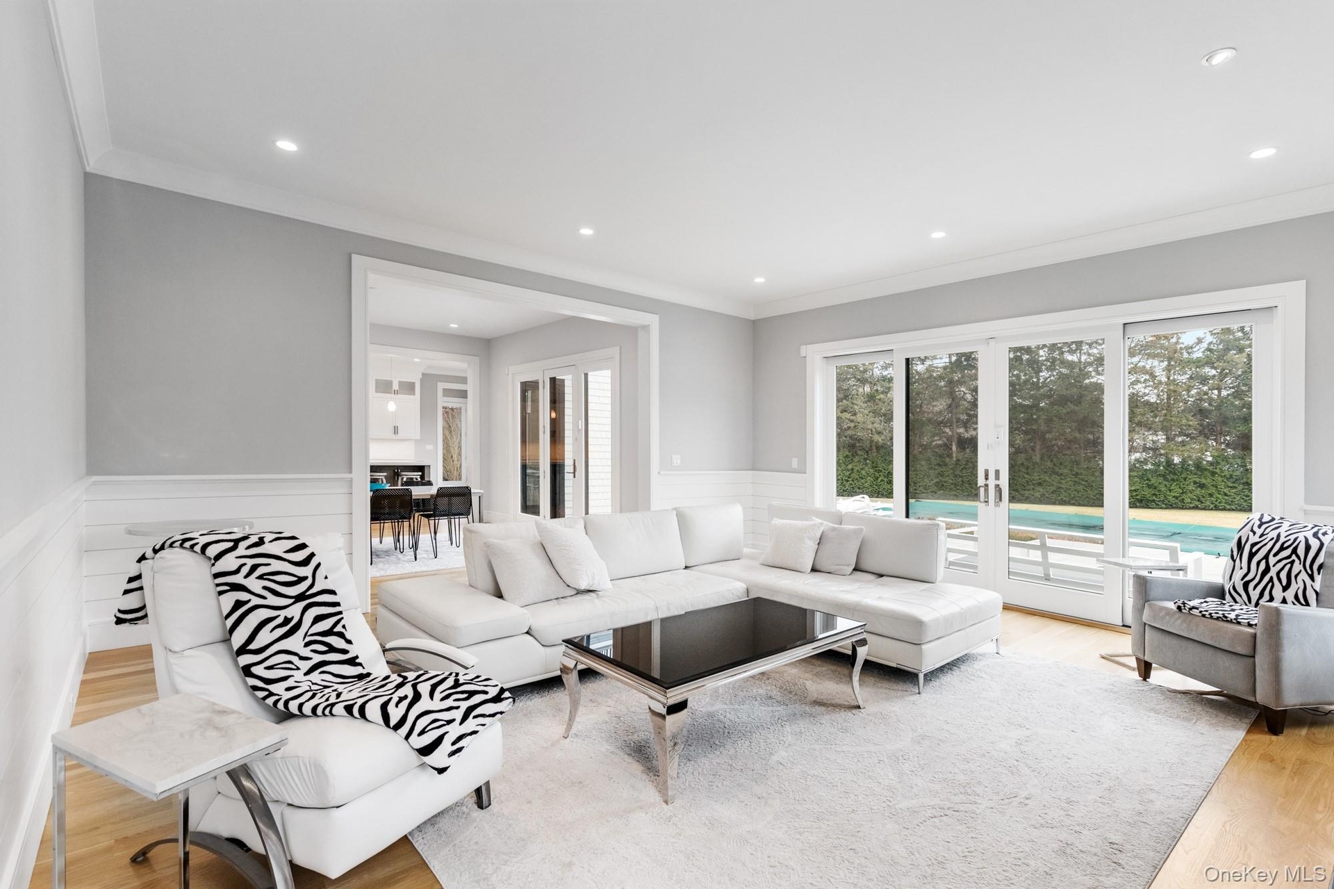 - Living room featuring french doors, crown molding, a wainscoted wall, wood finished floors, and recessed lighting