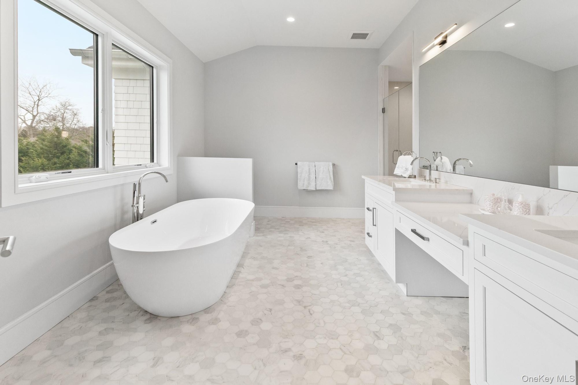 - Bathroom featuring lofted ceiling, double vanity, a freestanding bath, a stall shower, and recessed lighting