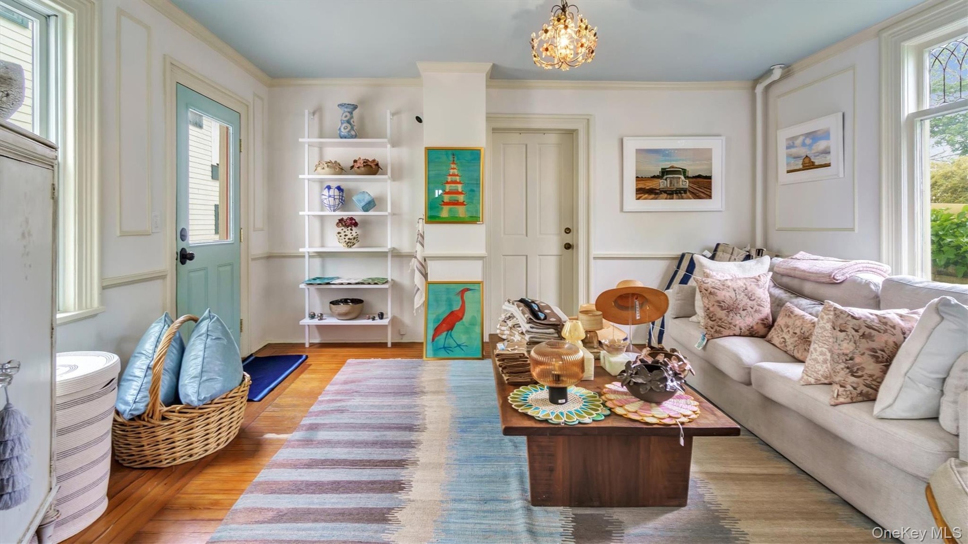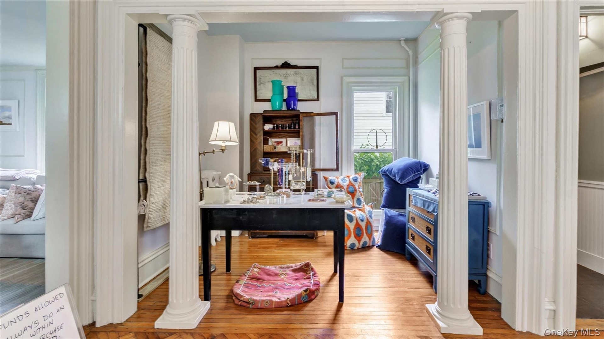 - Living room with a chandelier, wood finished floors, and ornate columns