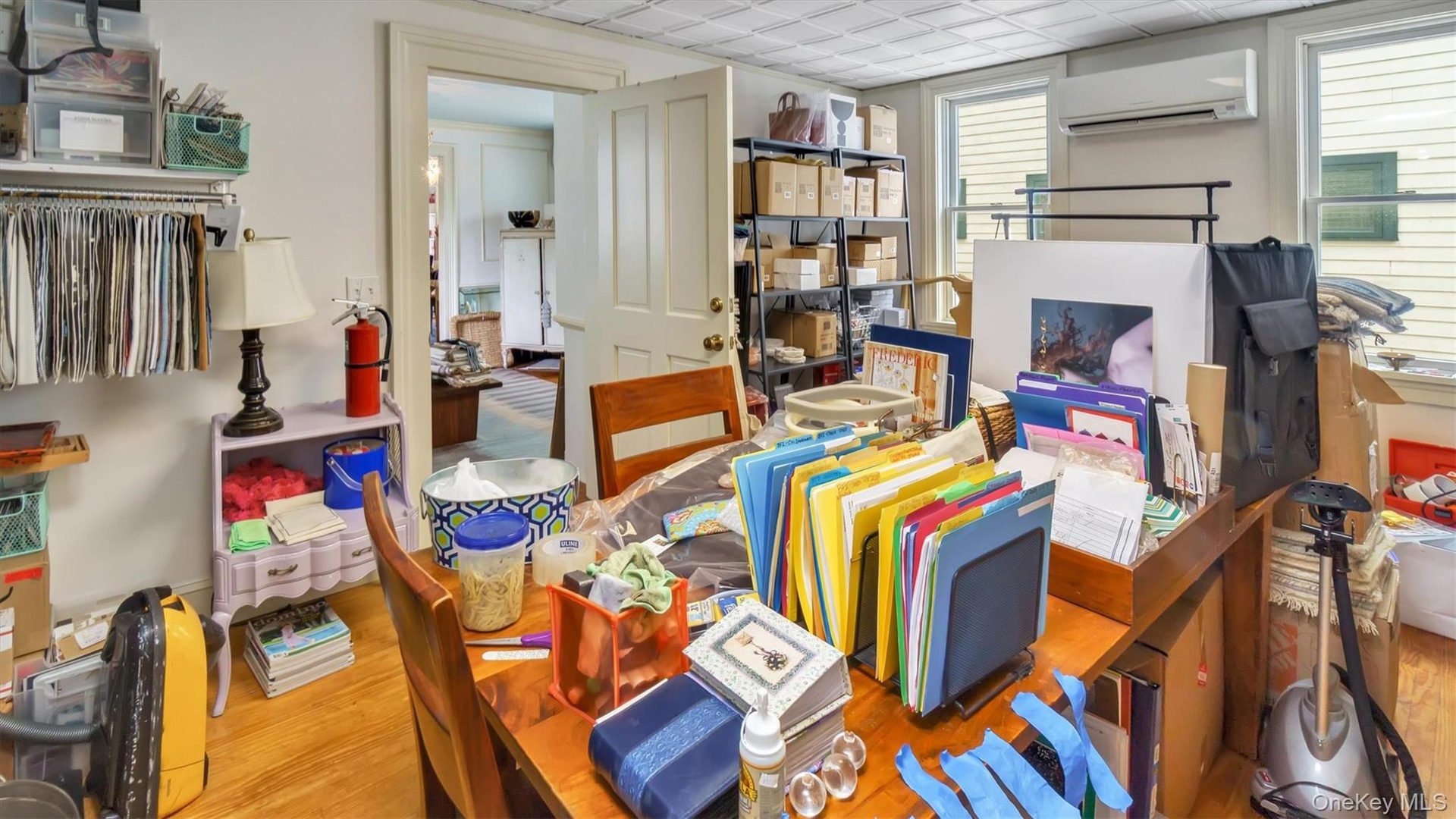 - Living room featuring a wall mounted AC, wood finished floors, and crown molding
