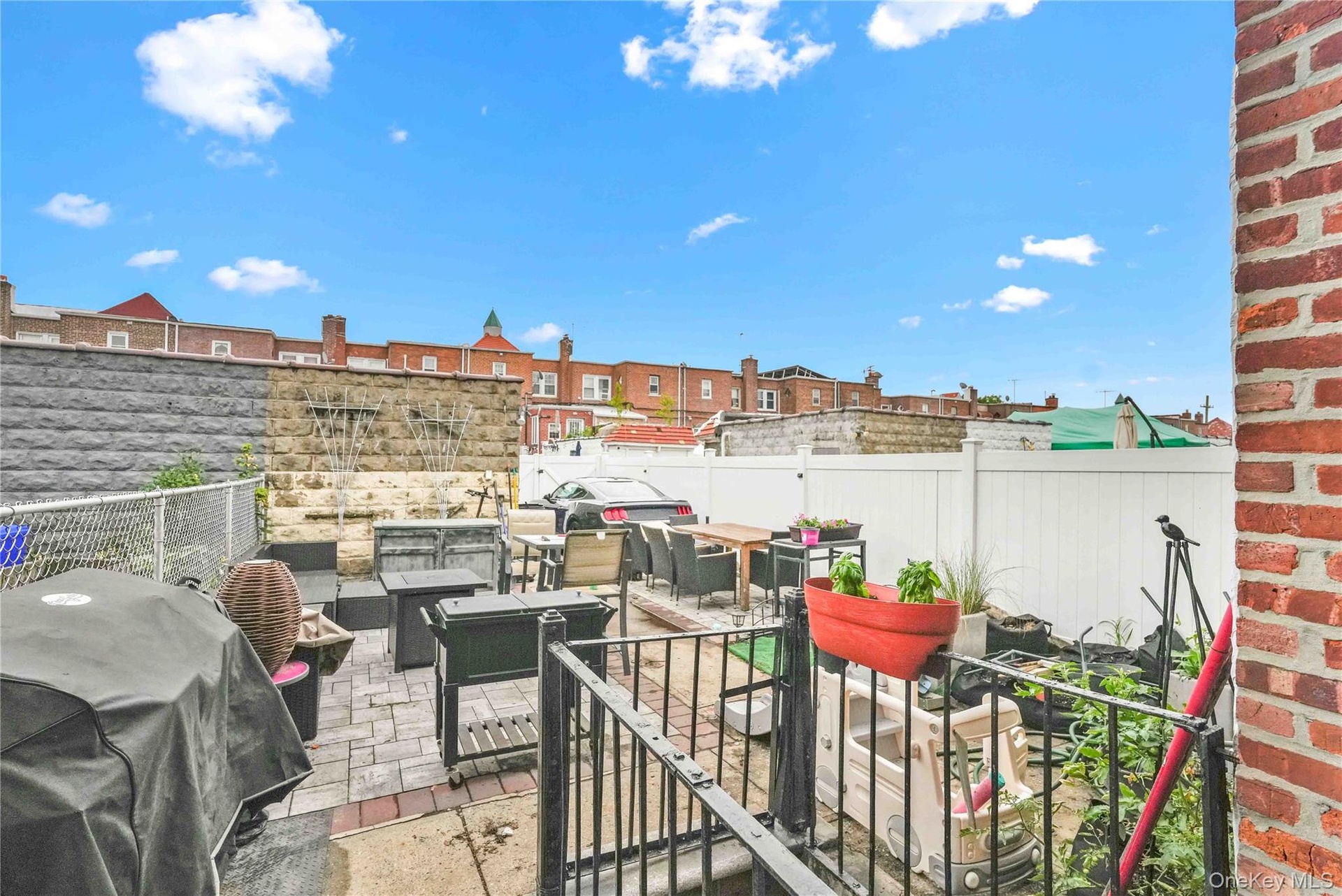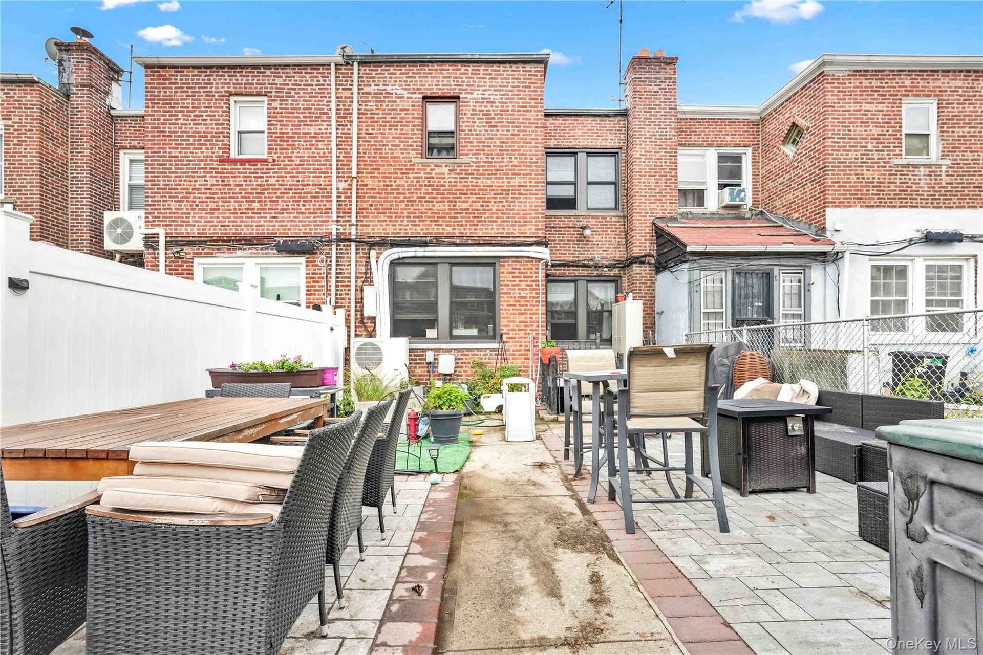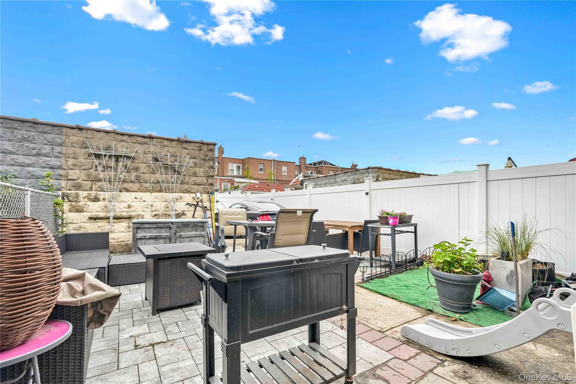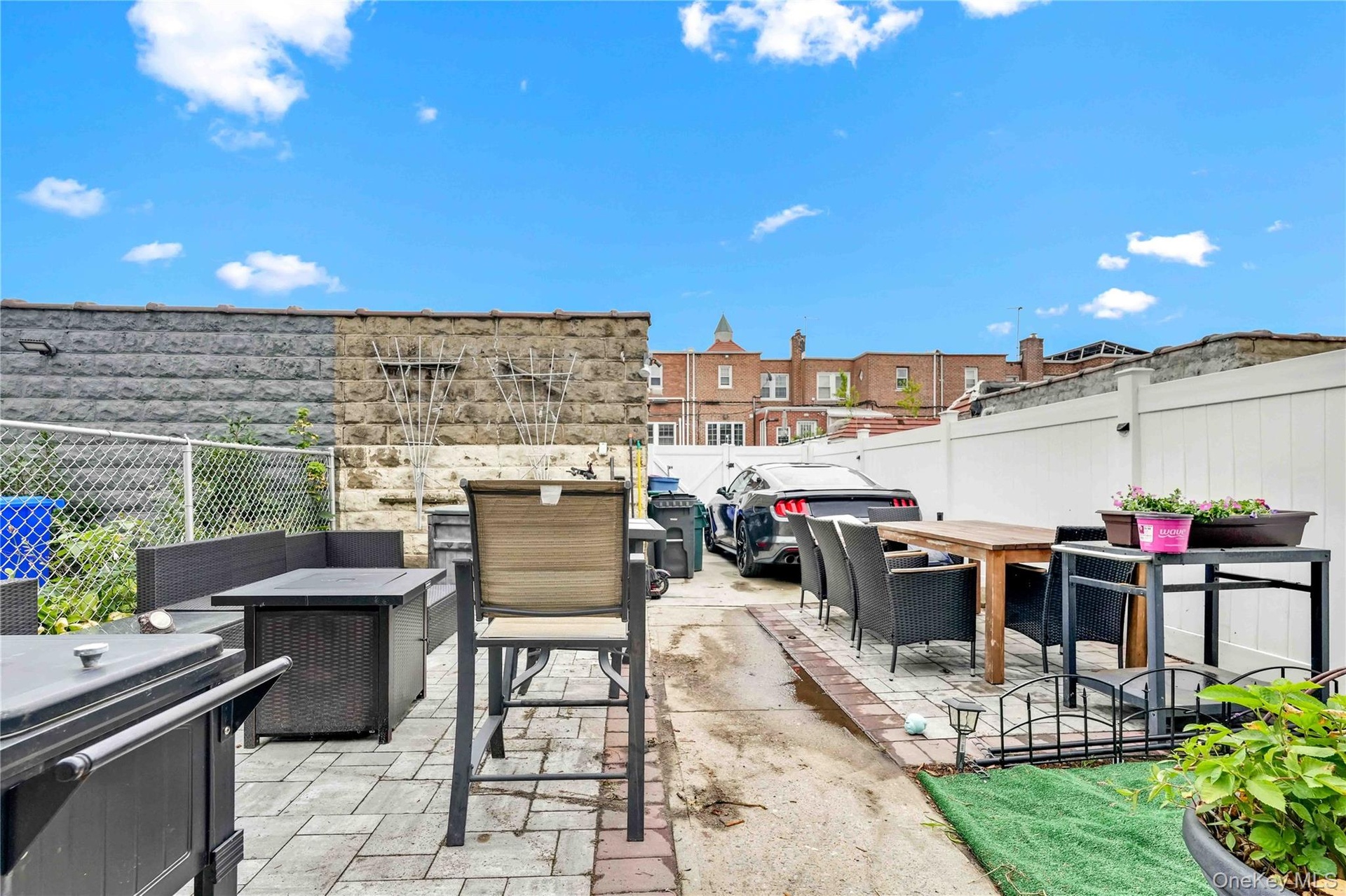- Fenced backyard with outdoor dining space and a patio