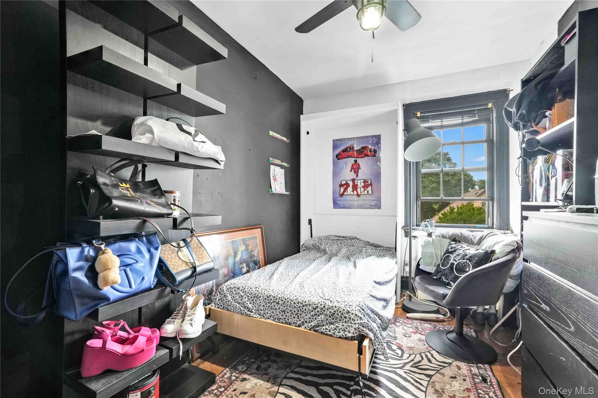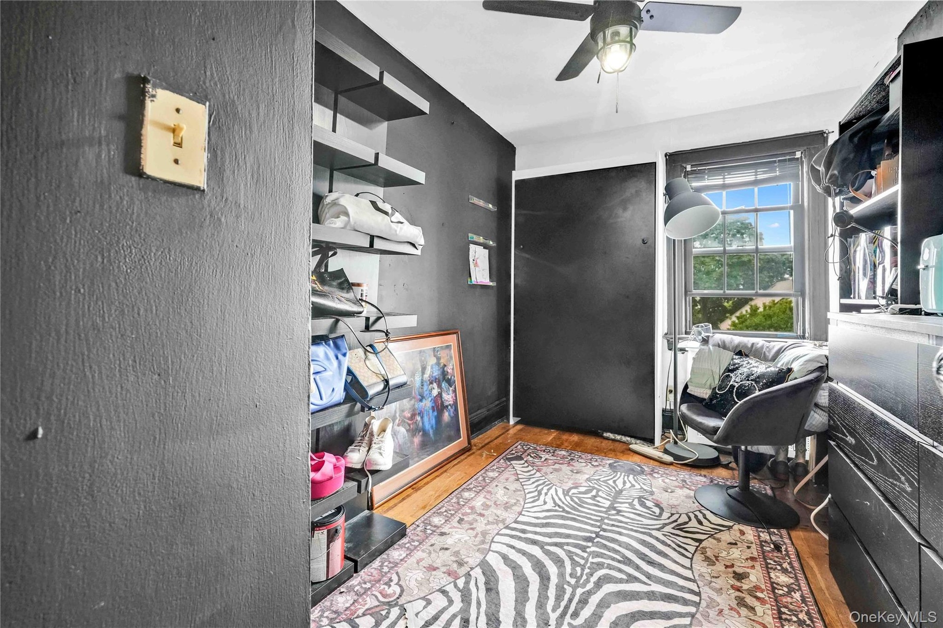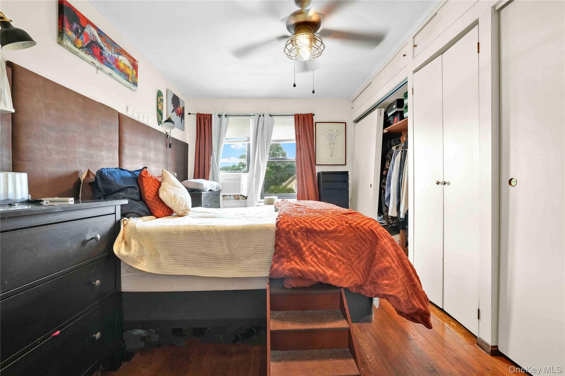 - Bedroom featuring hardwood / wood-style floors, a closet, and ceiling fan