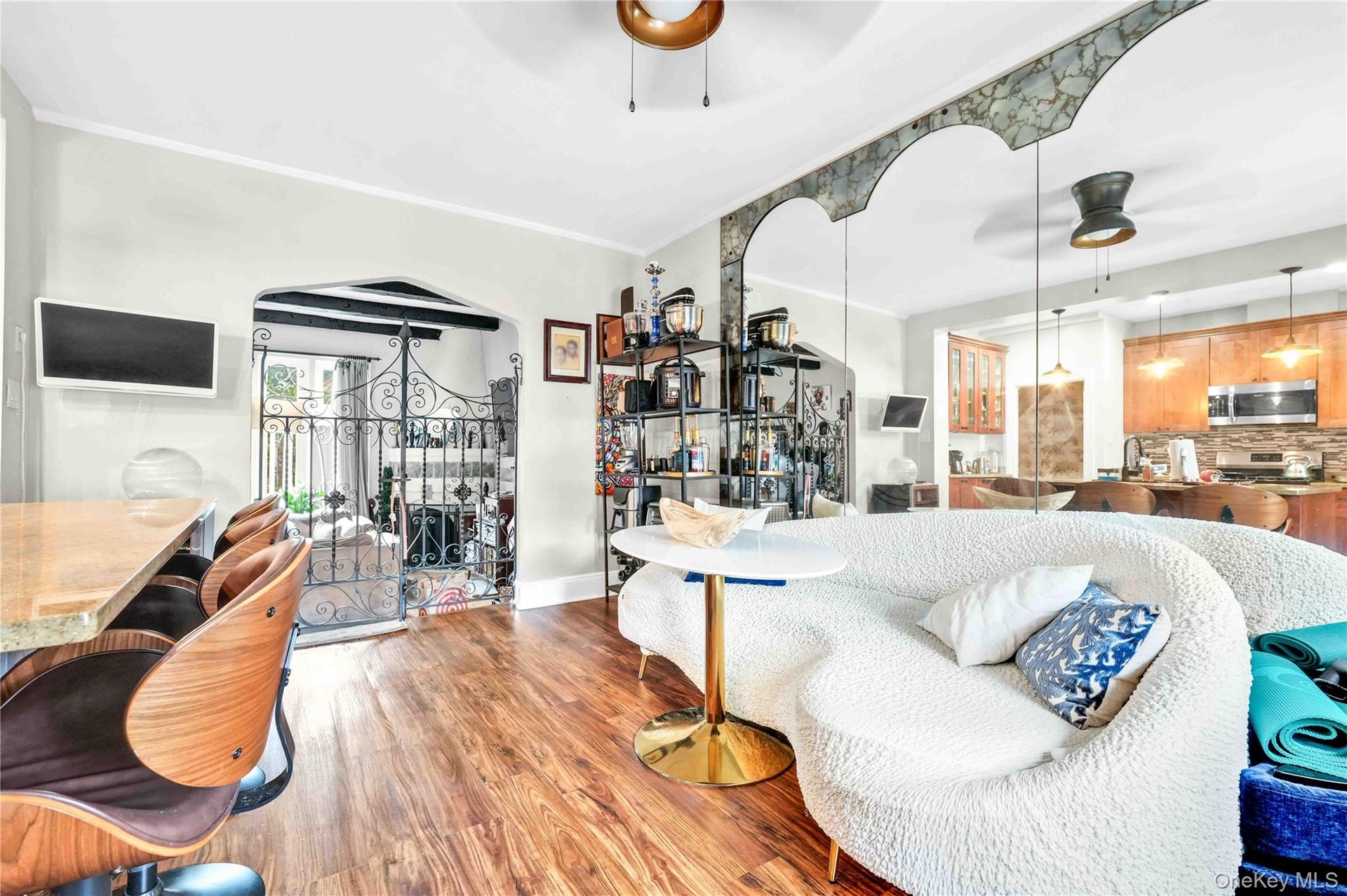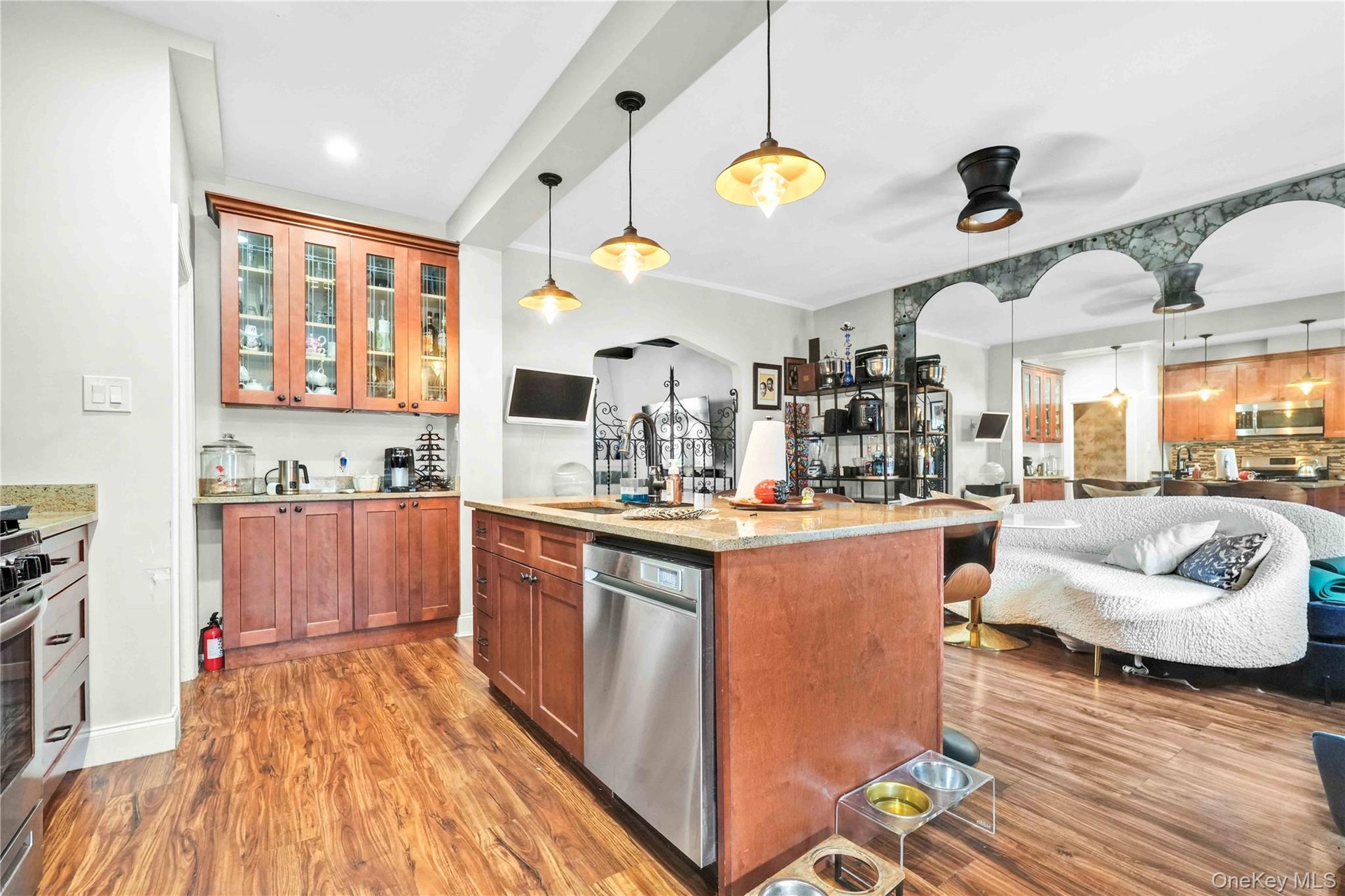 - Kitchen with stainless steel appliances, open floor plan, arched walkways, light wood-type flooring, and recessed lighting