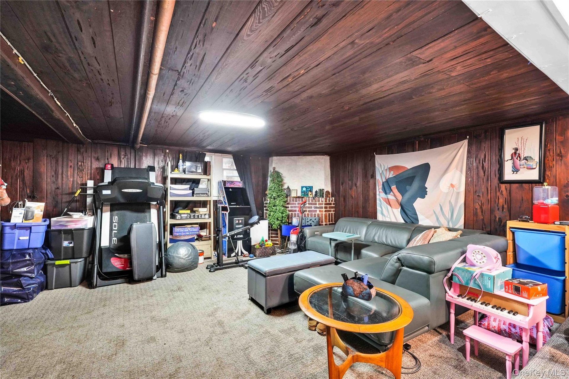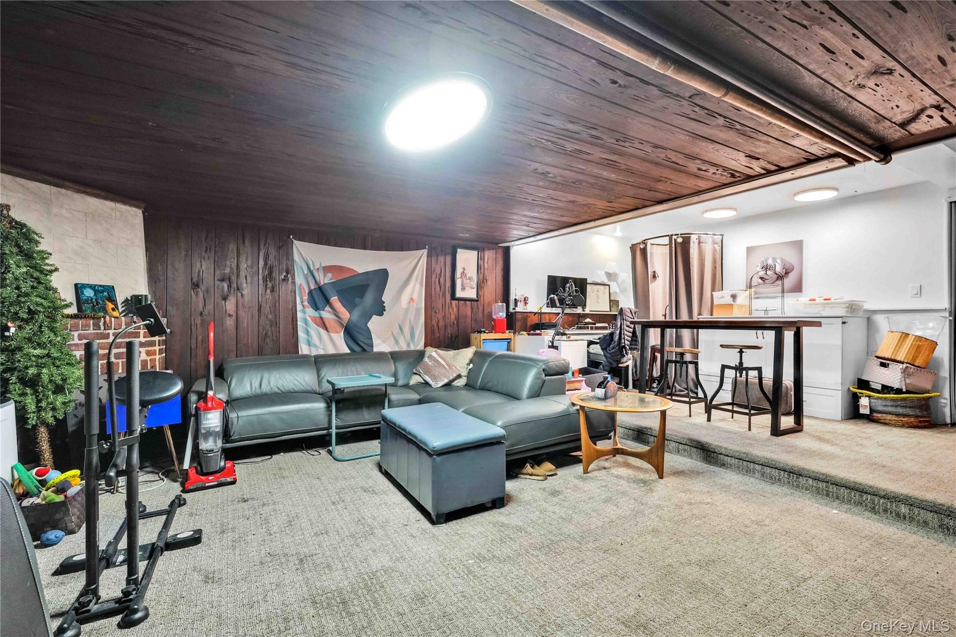 - Carpeted living room with wood walls and wood ceiling