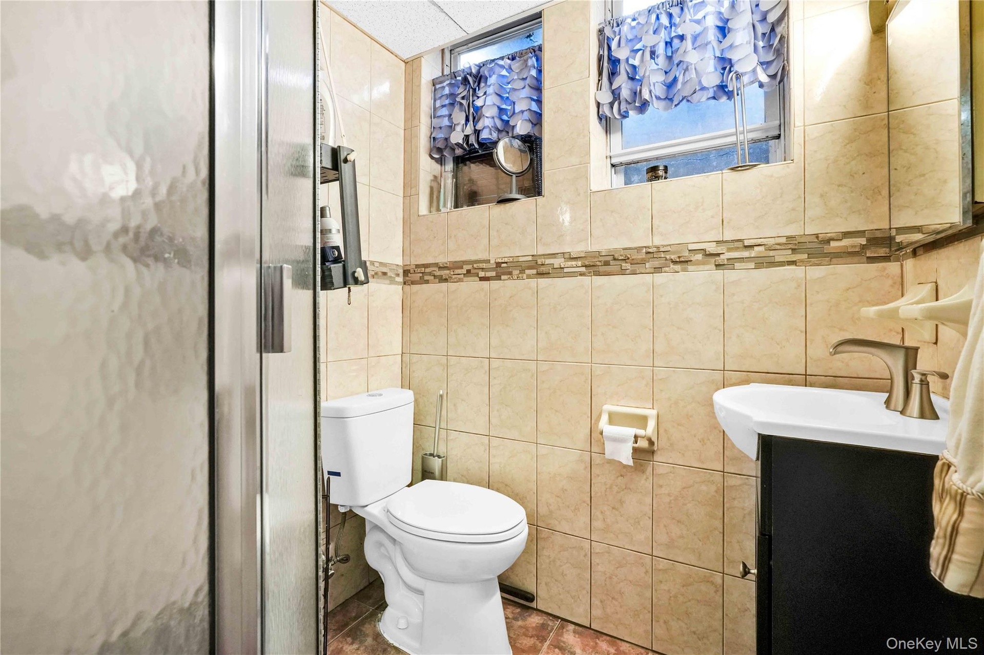- Bathroom featuring vanity, tile walls, and a shower with shower door