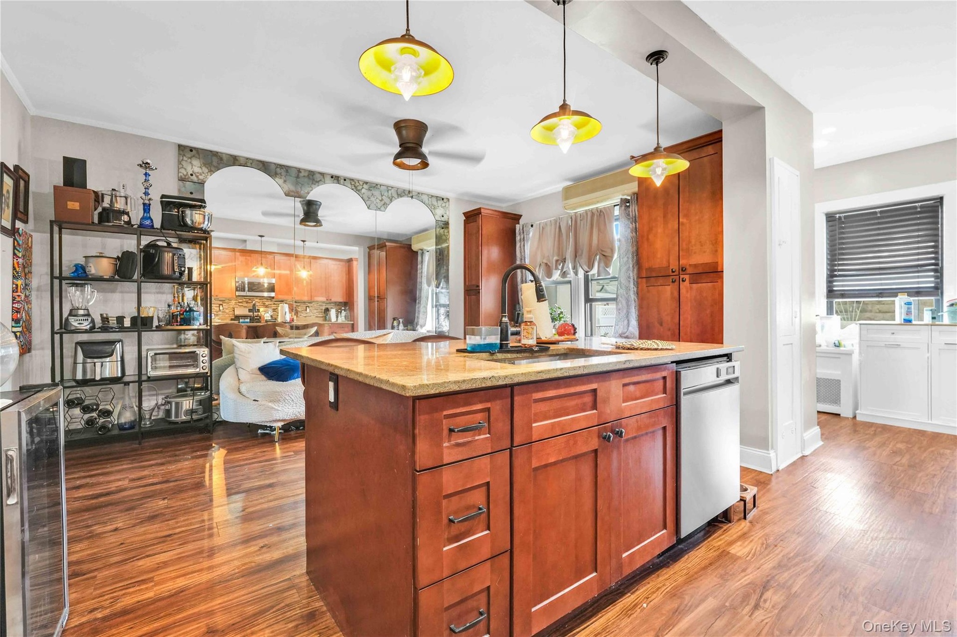- Kitchen with dark wood-style flooring, beverage cooler, ceiling fan, backsplash, and light stone counters