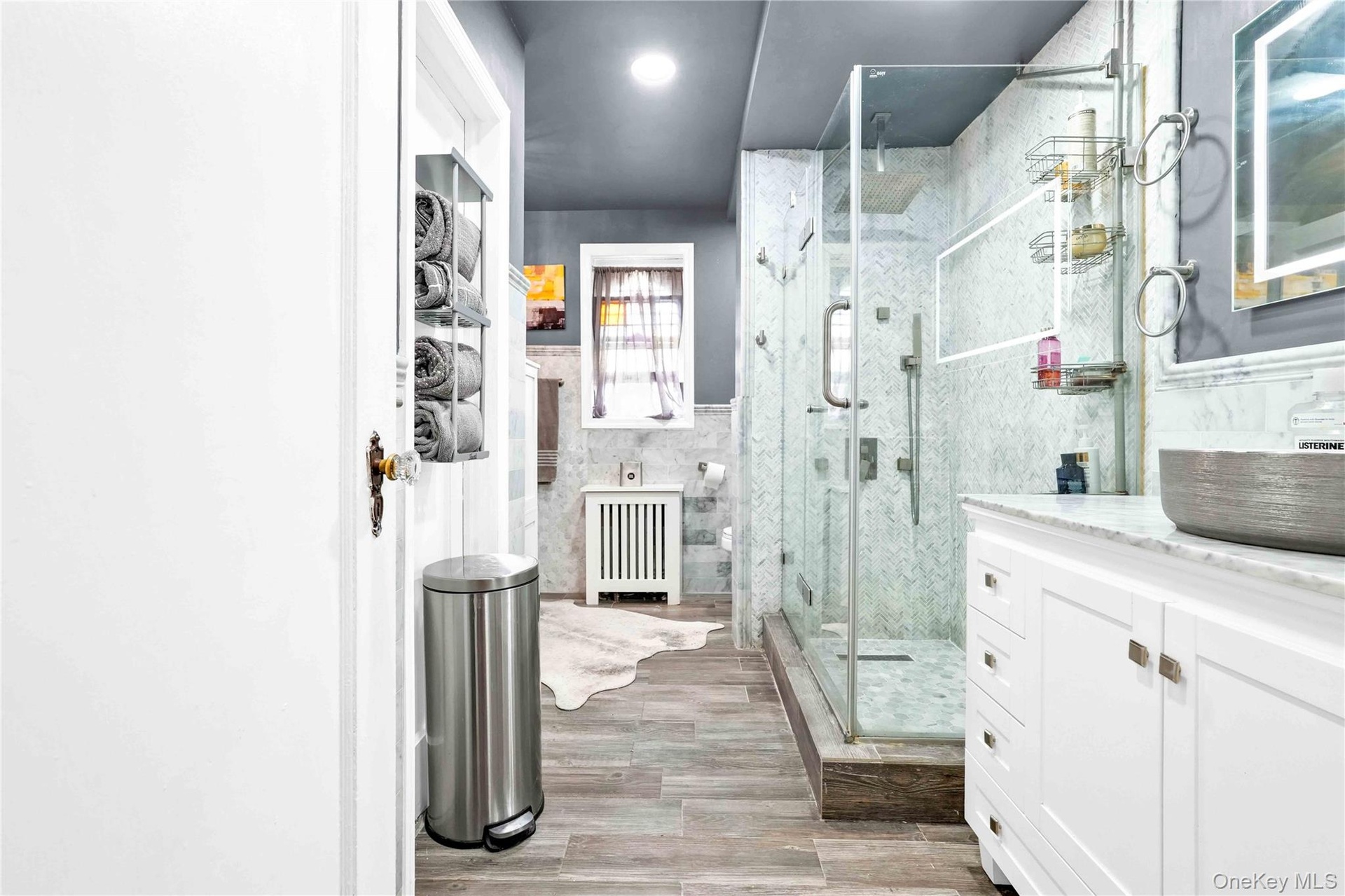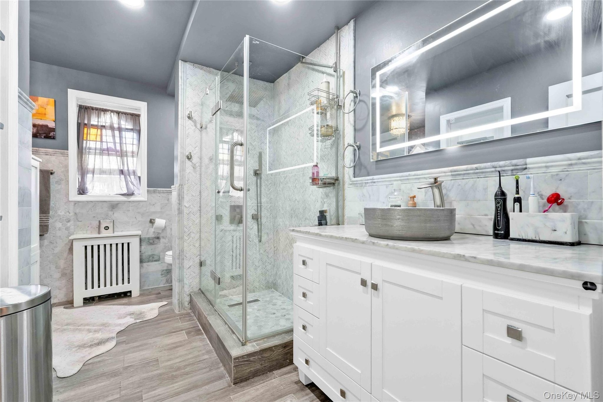 - Bathroom featuring radiator, a marble finish shower, vanity, wood finished floors, and tile walls