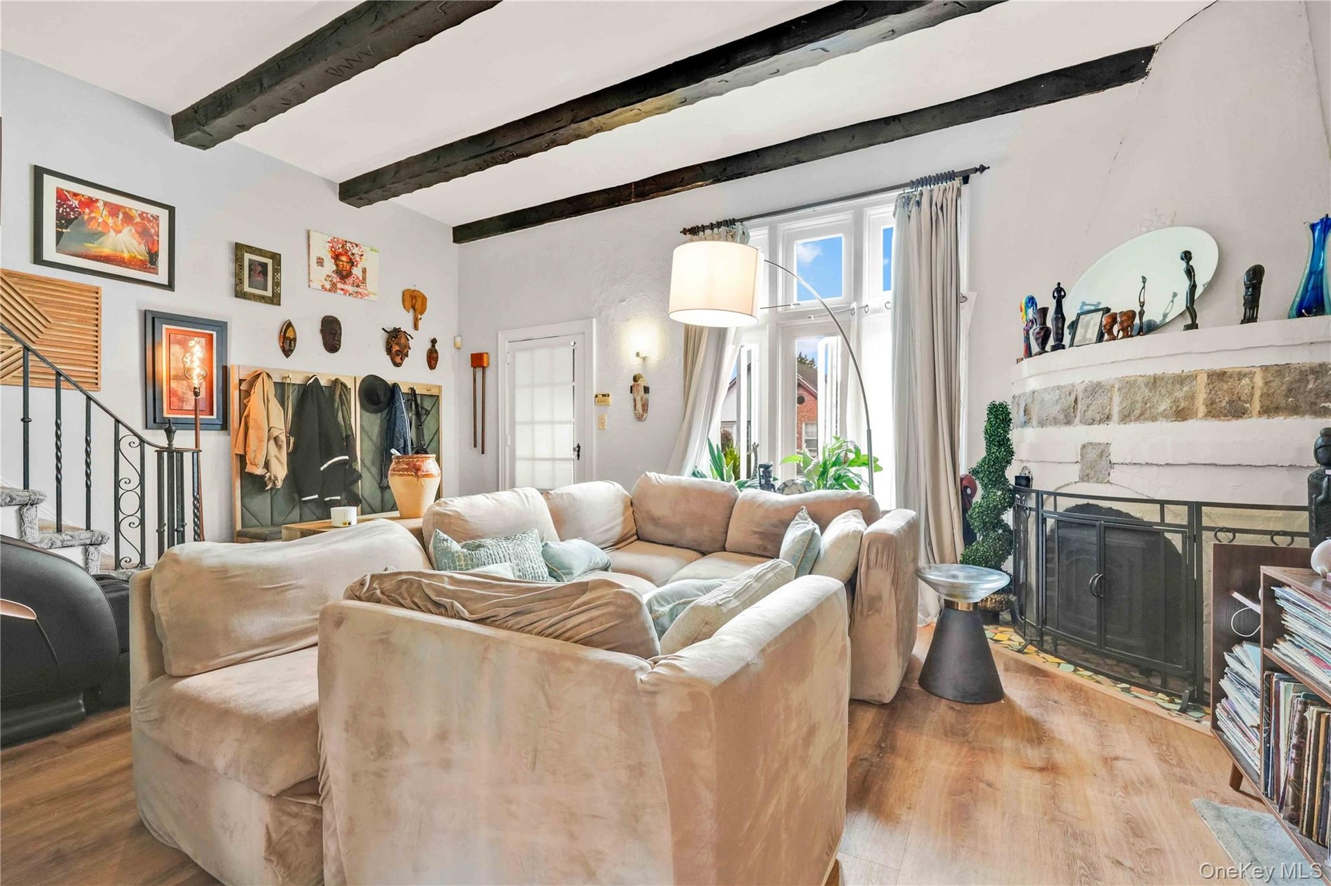 - Living room with wood finished floors, beamed ceiling, stairway, and a fireplace