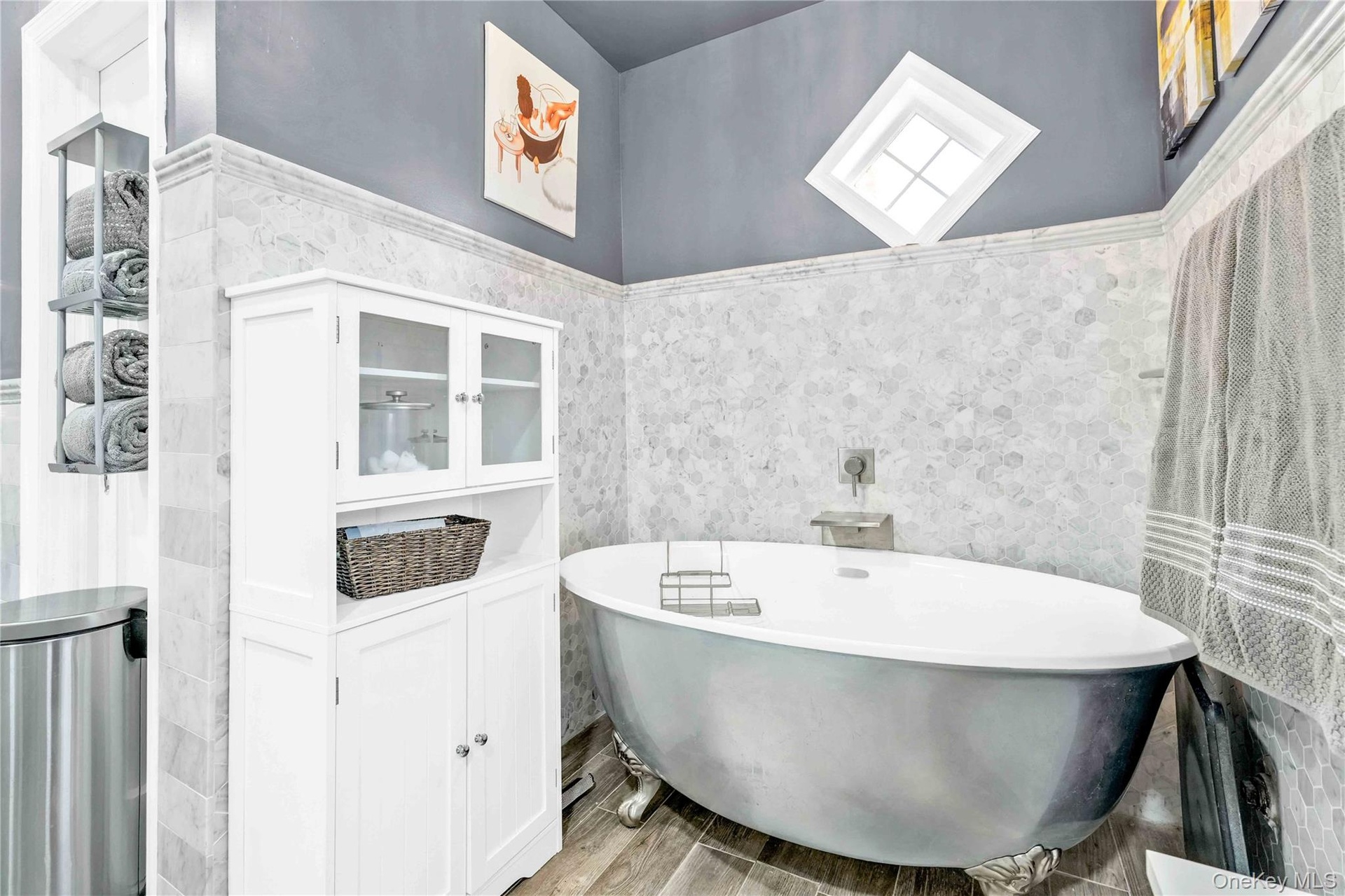 - Full bathroom featuring a freestanding tub, wood finished floors, and a wainscoted wall