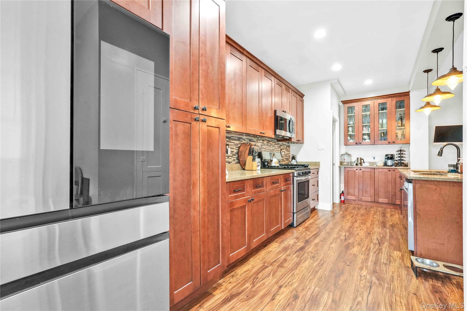 - Kitchen featuring appliances with stainless steel finishes, light wood-type flooring, glass insert cabinets, recessed lighting, and brown cabinets