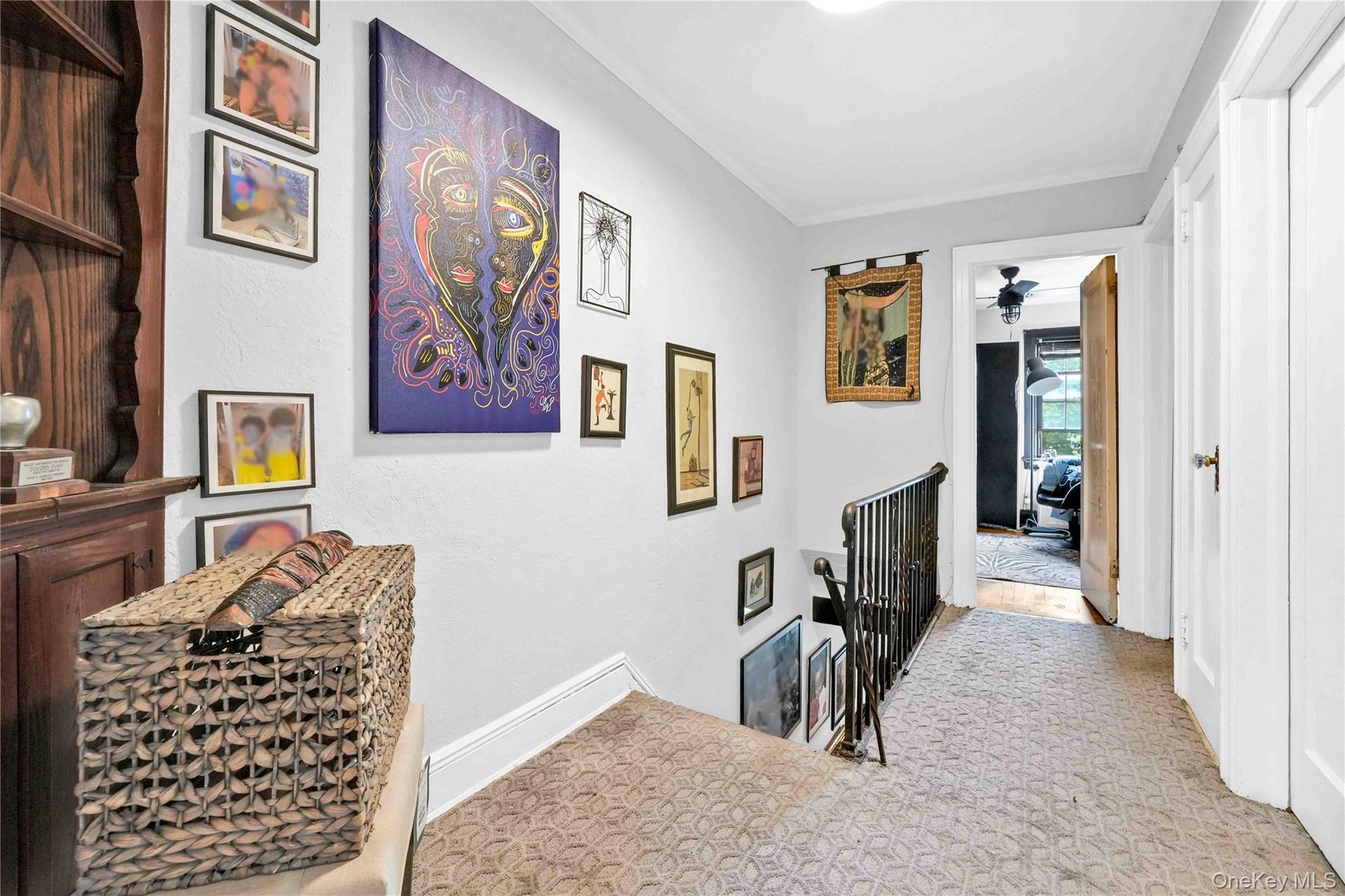- Hall featuring an upstairs landing, ornamental molding, and carpet