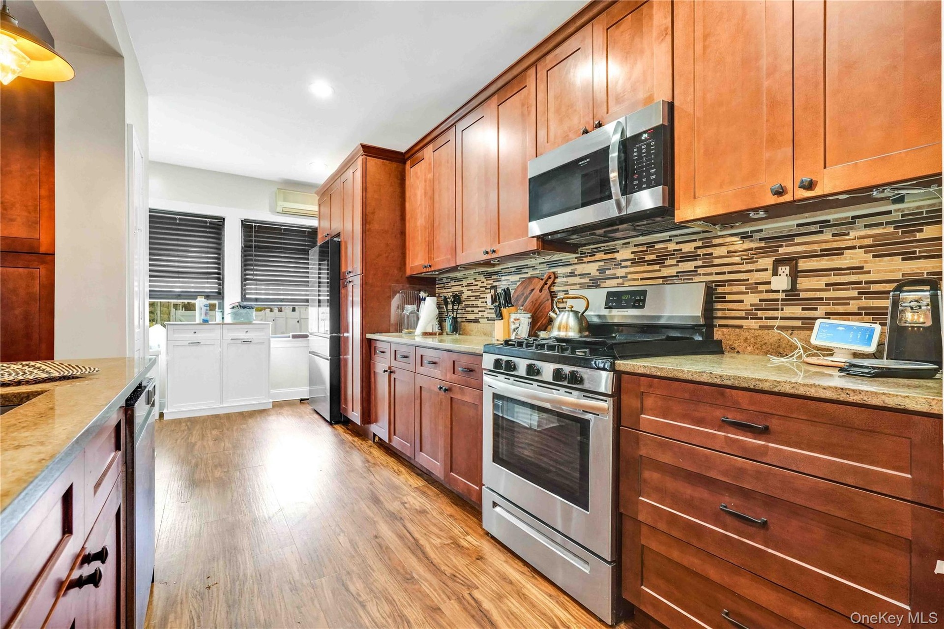 - Kitchen with stainless steel appliances, light wood-type flooring, decorative backsplash, light stone counters, and recessed lighting