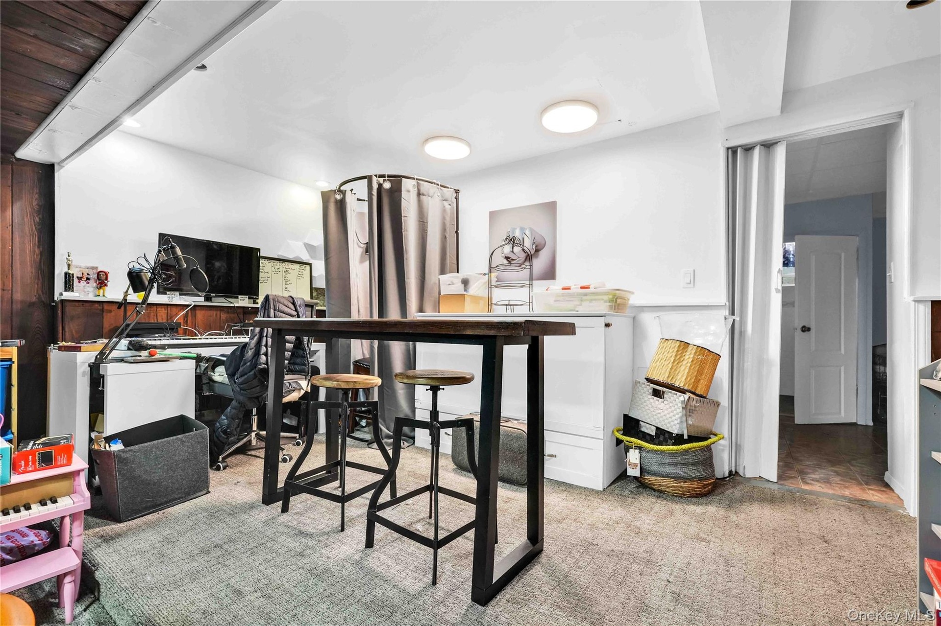 - Living area with wood ceiling, carpet floors, and wooden walls