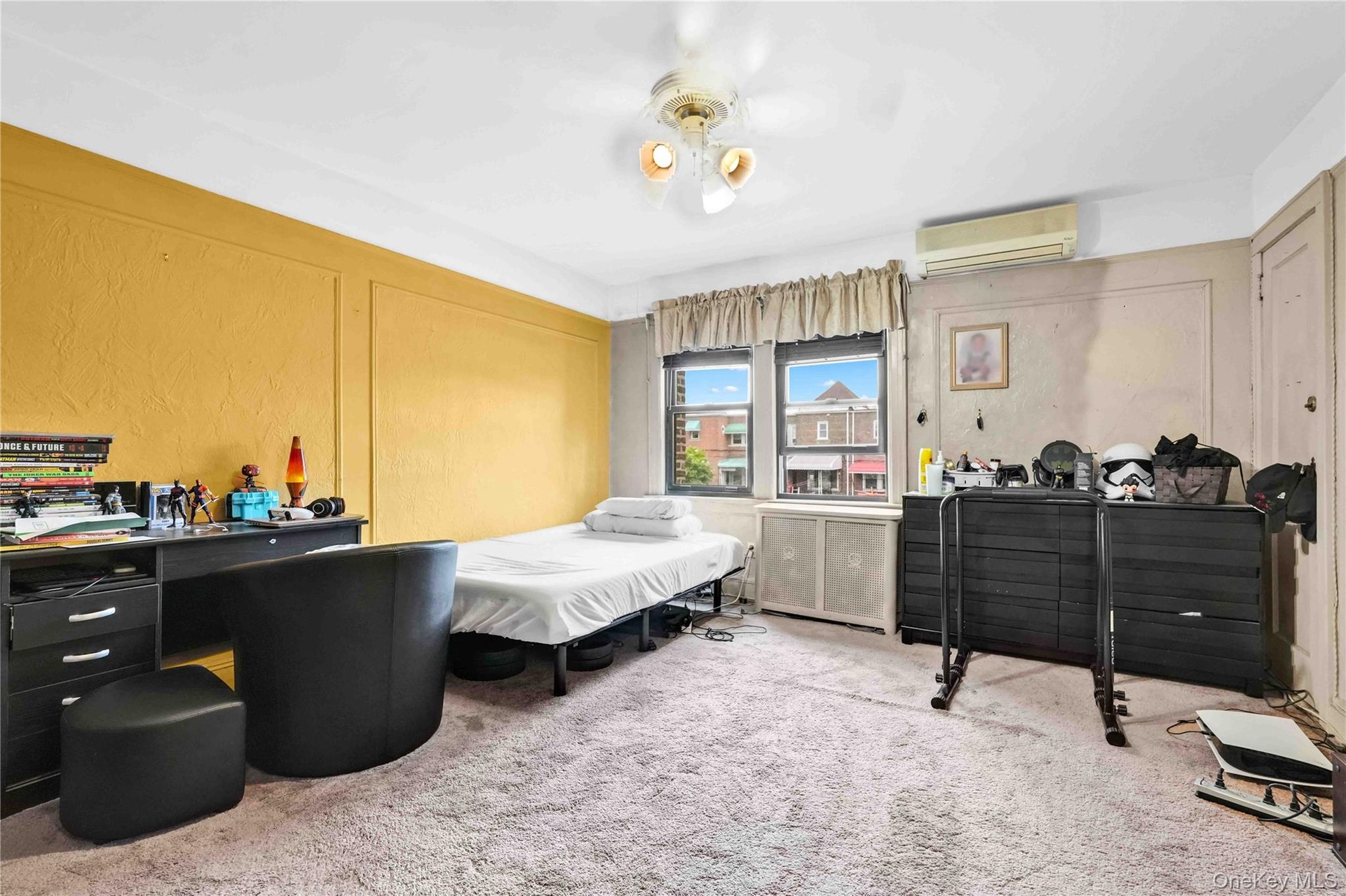 - Bedroom with a wall mounted air conditioner and carpet floors