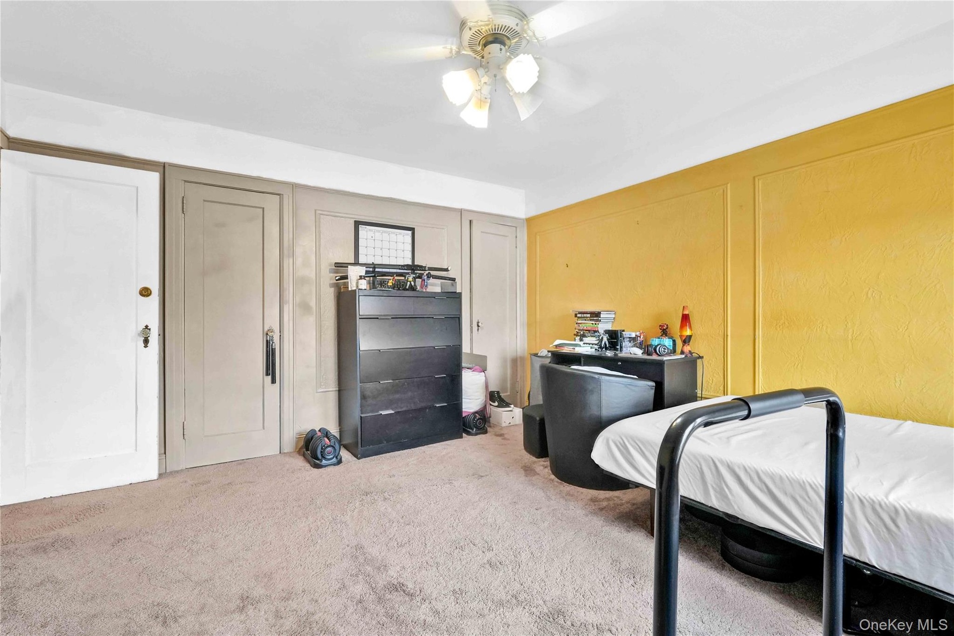 - Carpeted bedroom with ceiling fan