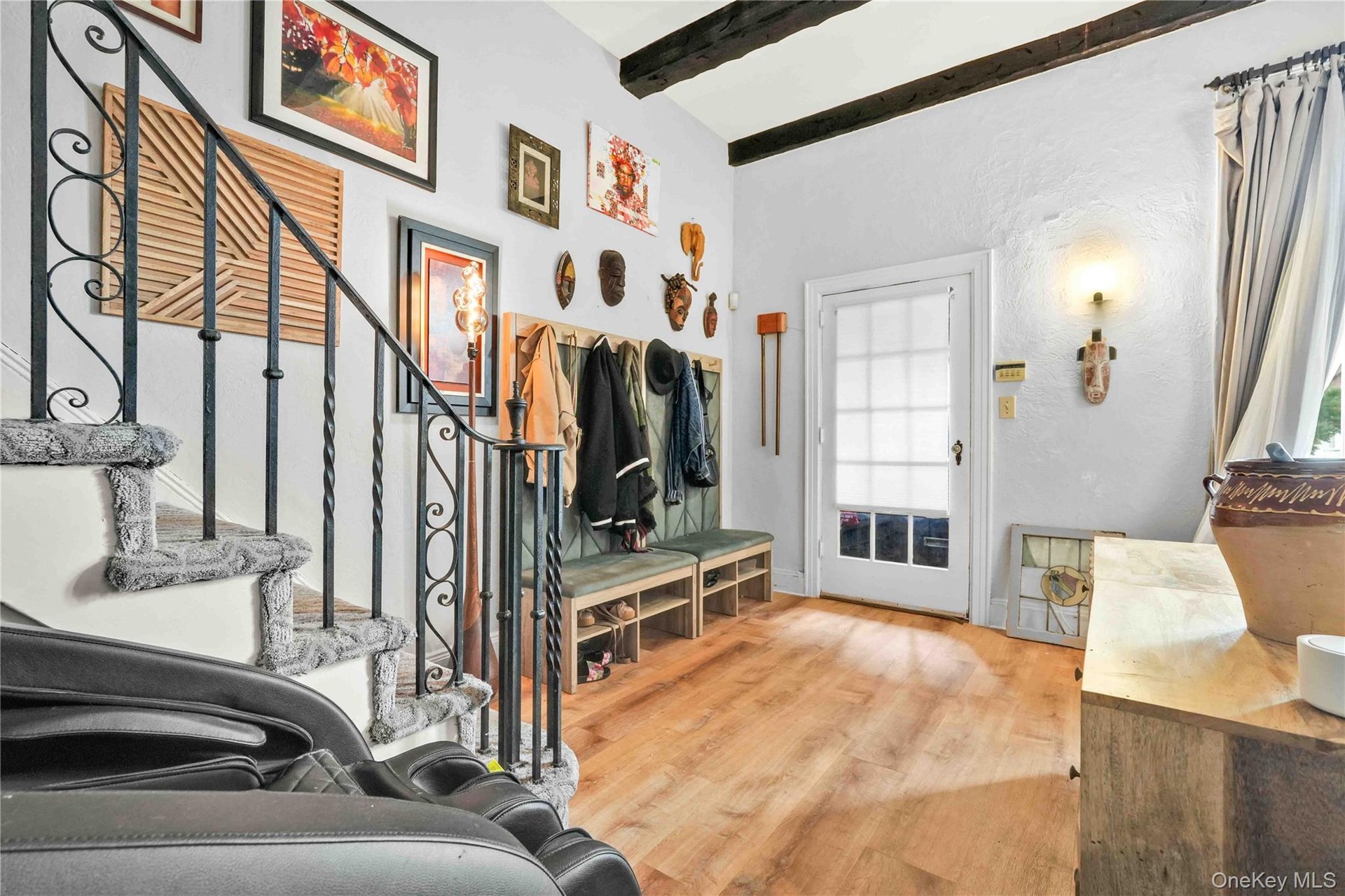 - Mudroom with wood finished floors and beam ceiling