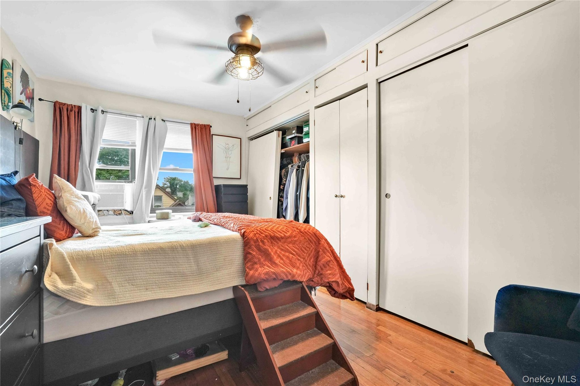 - Bedroom with multiple closets, light wood-style flooring, and a ceiling fan