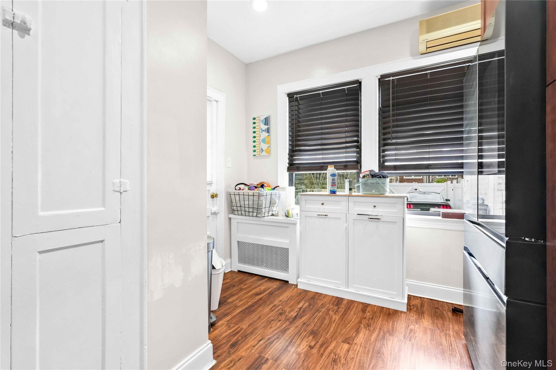 - Kitchen featuring a wall mounted air conditioner, white cabinetry, dark wood-style flooring, and recessed lighting