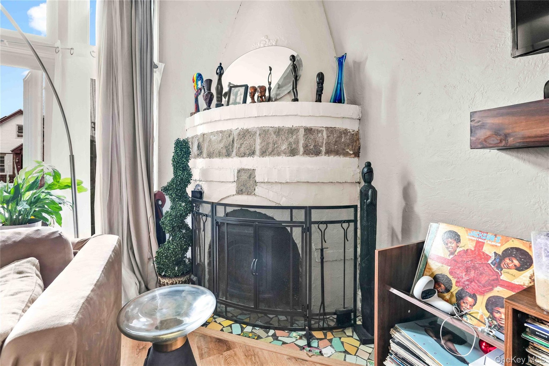 - Living room featuring wood finished floors and a fireplace