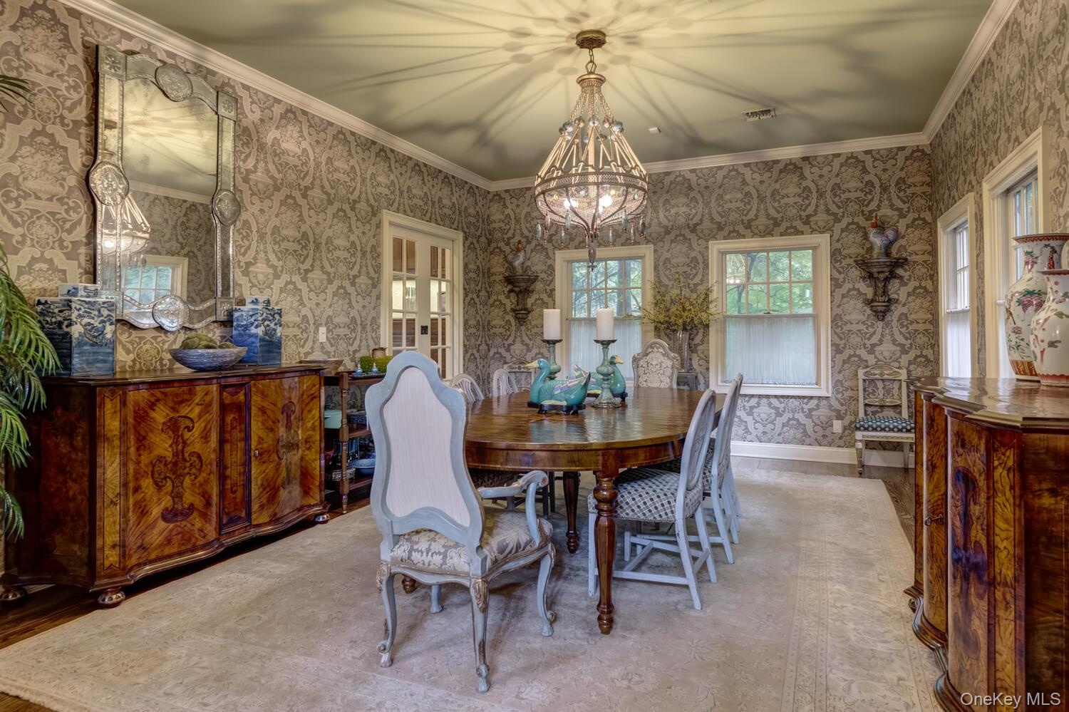 - Dining room wiht high ceilings natural light and elevated crown molding