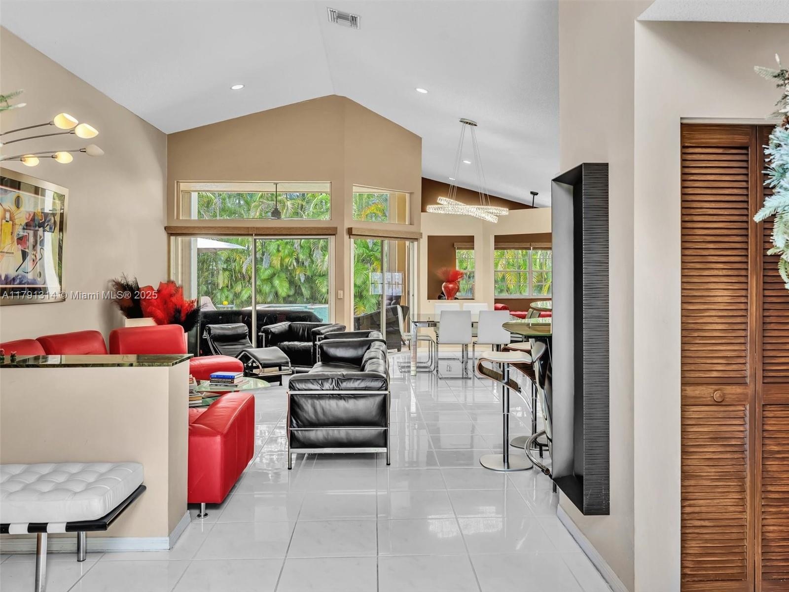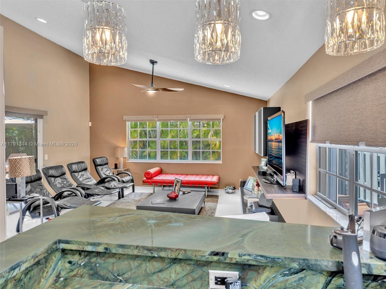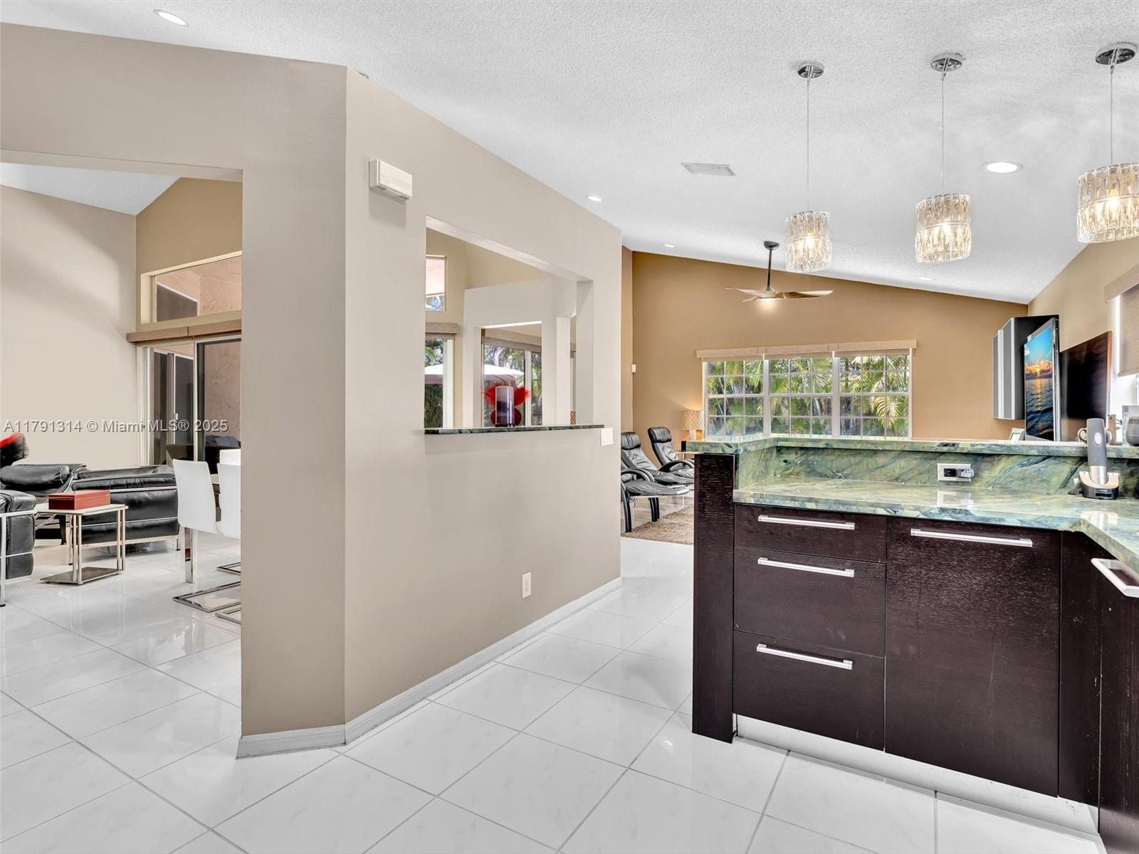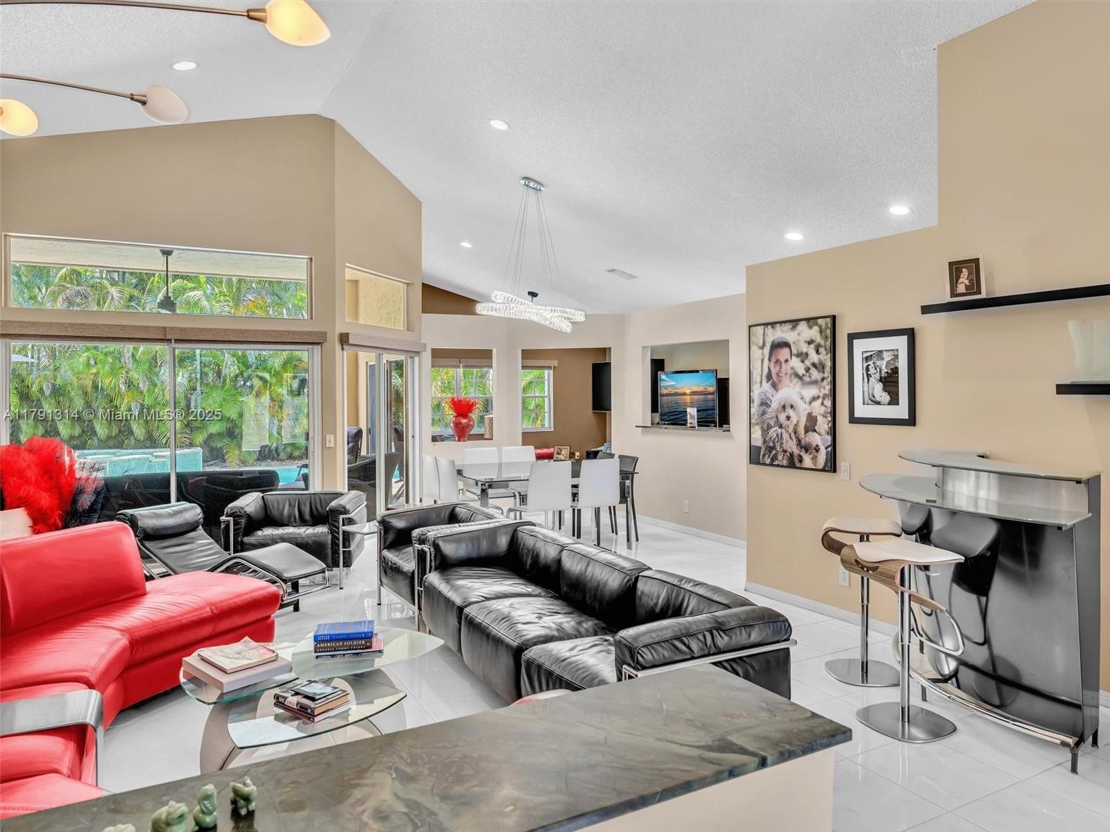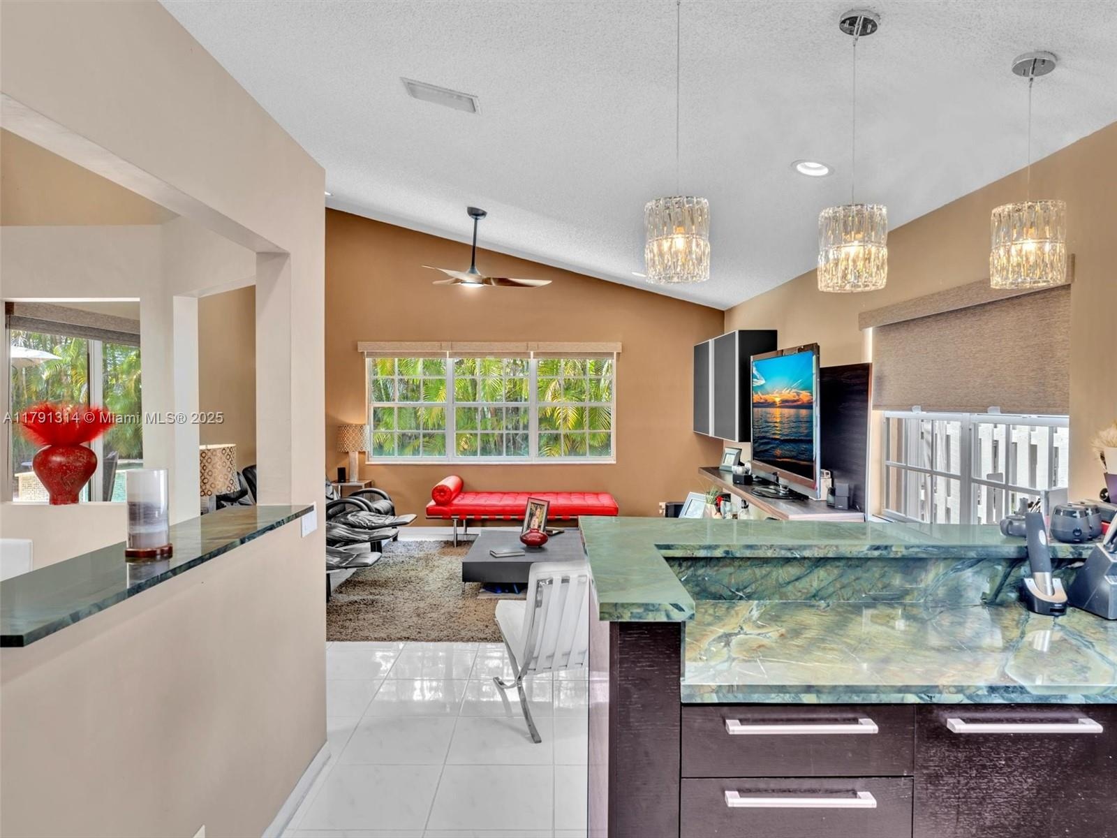 Spacious open plan filled with natural light. The kitchen, which overlooks the pool, features granite countertops and stainless steel appliances.