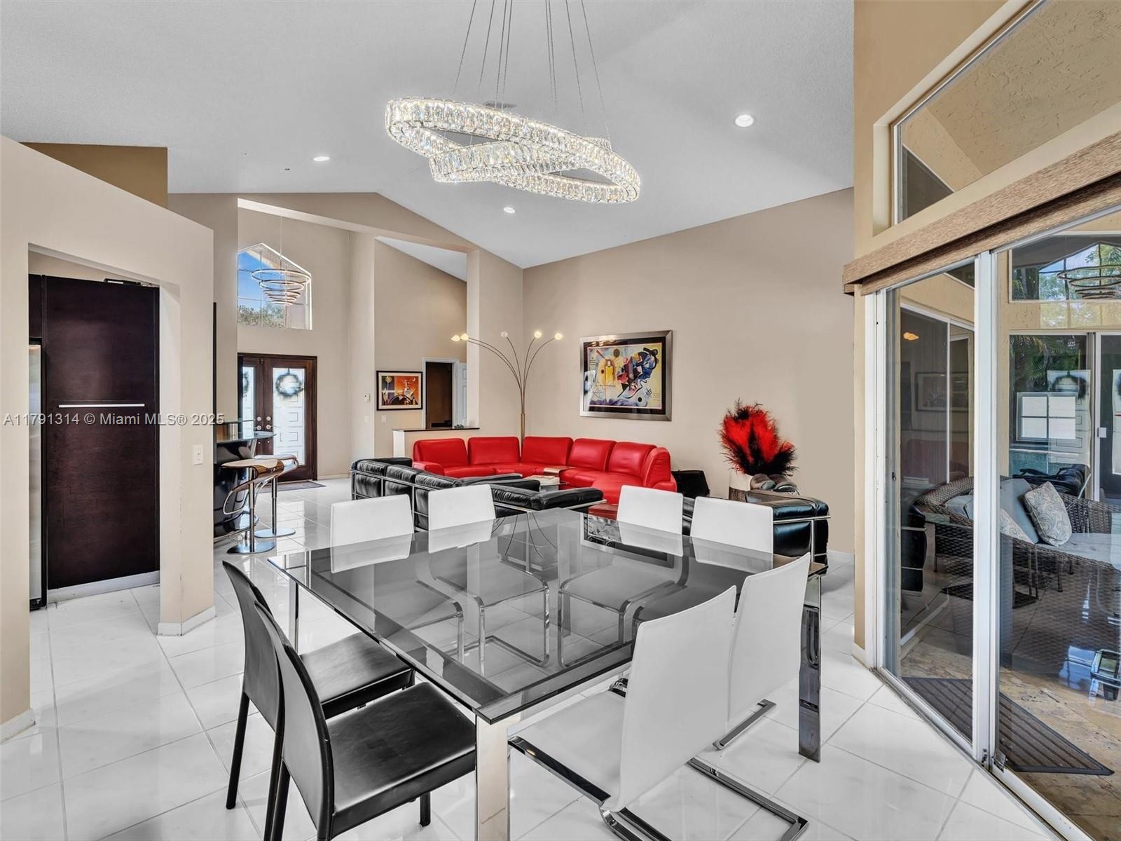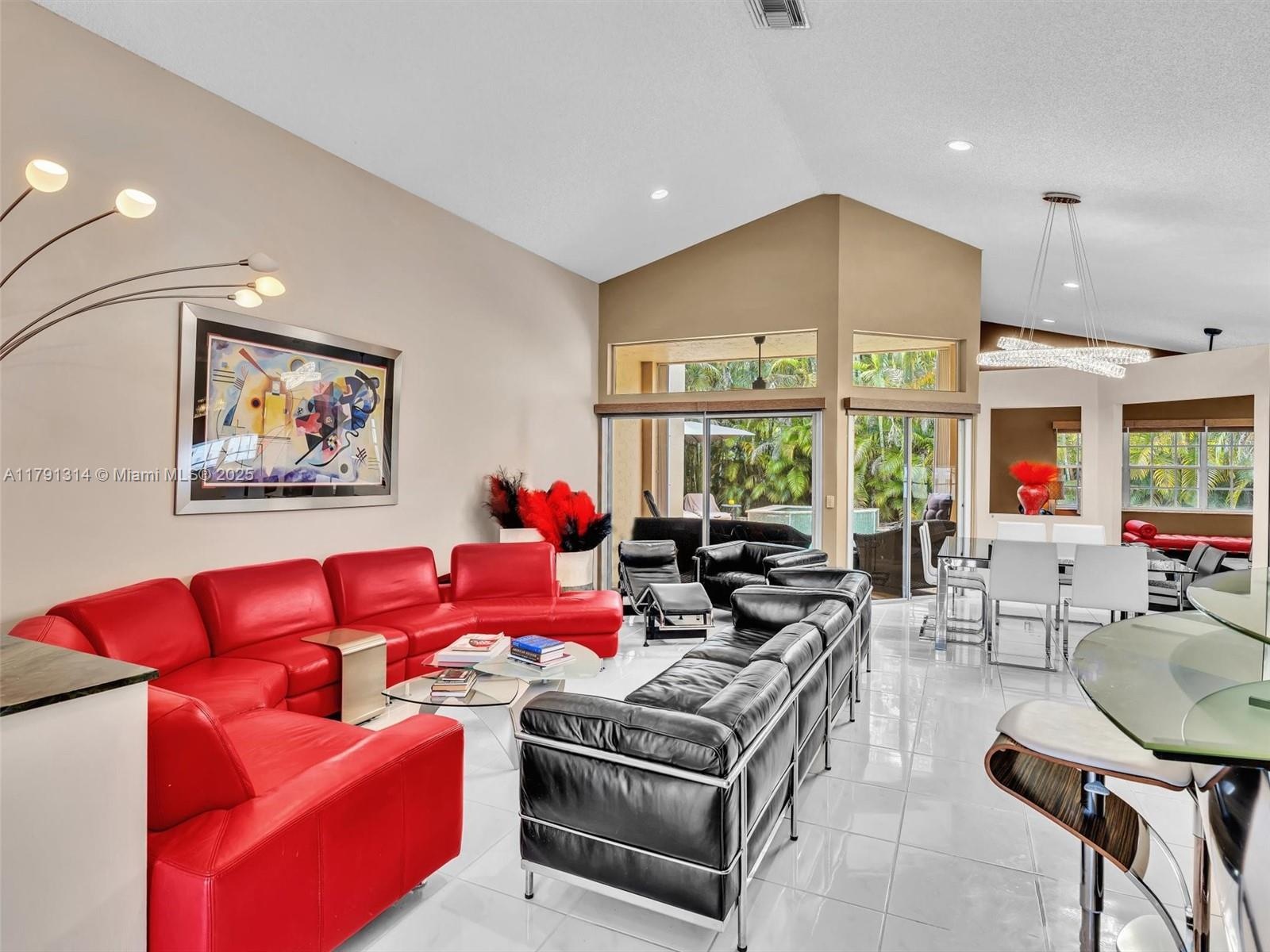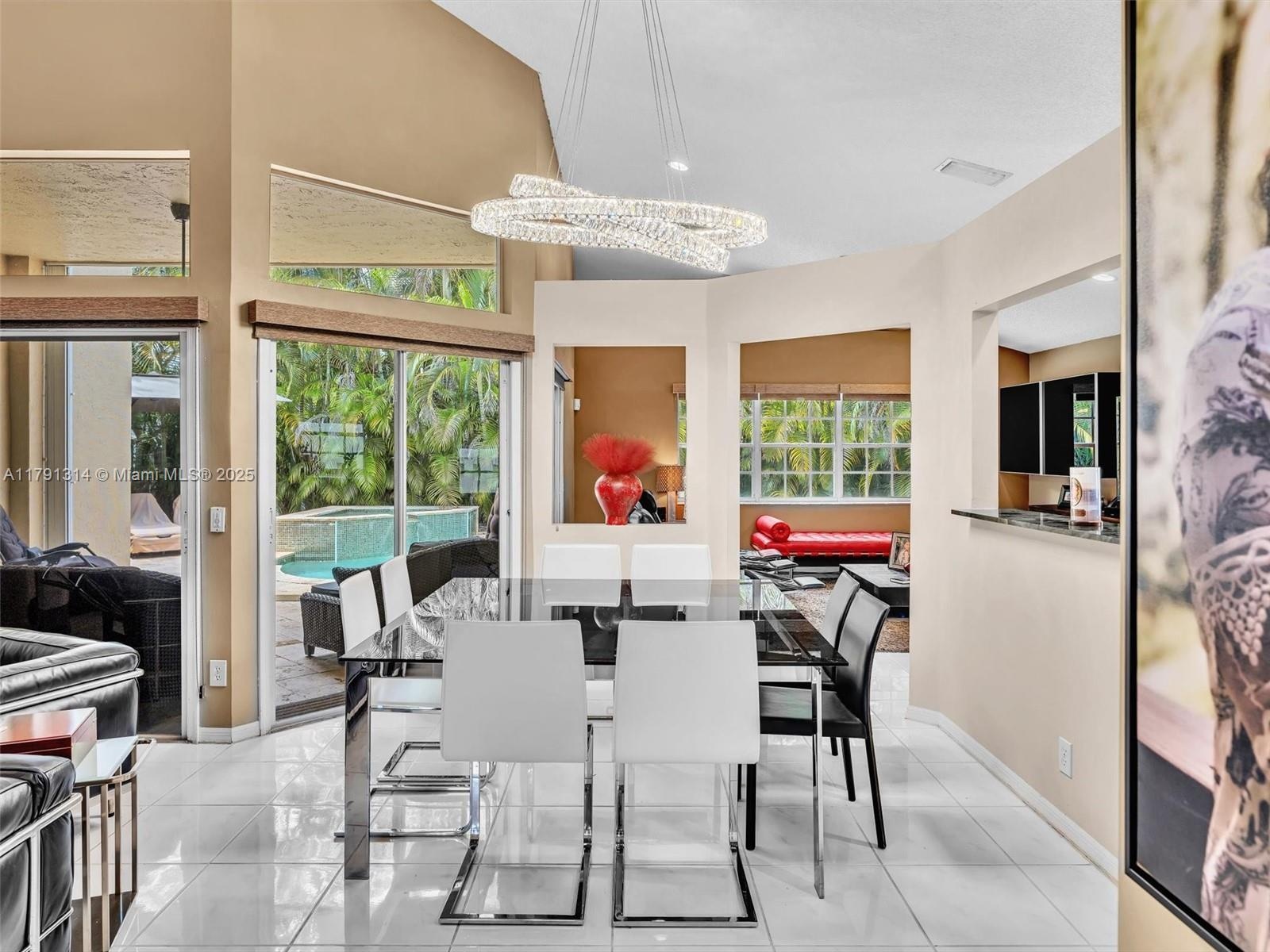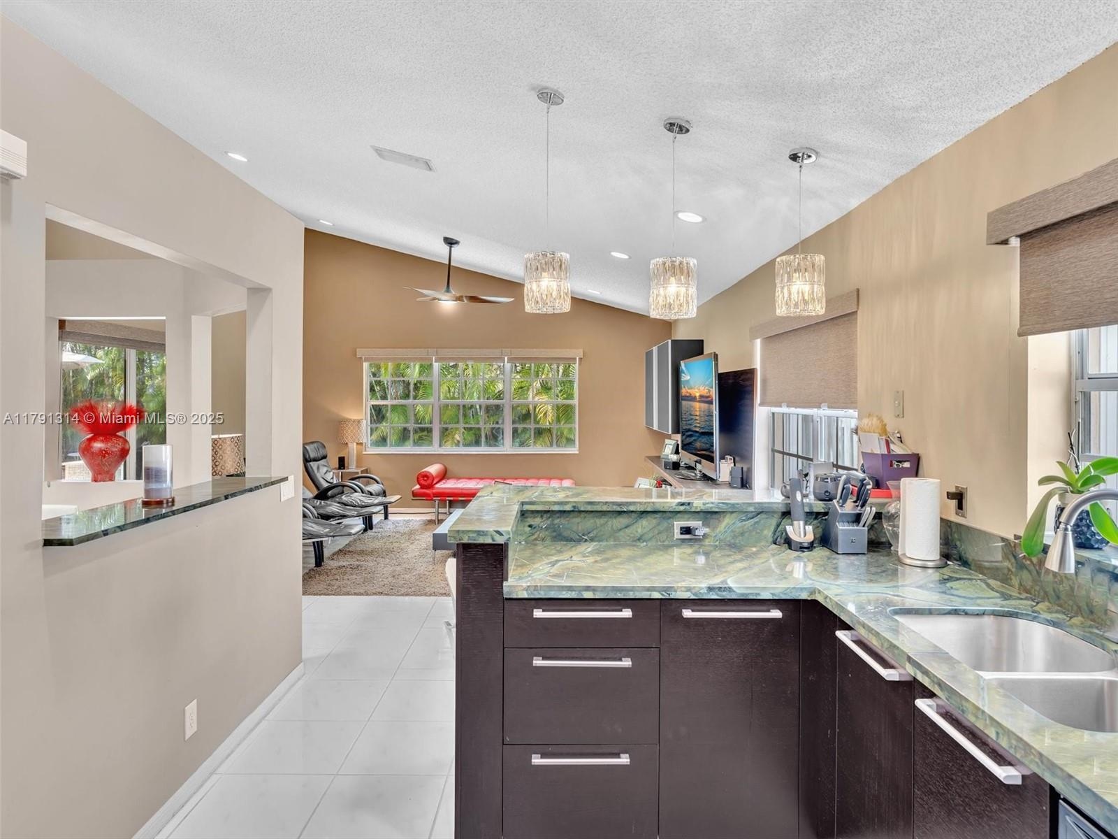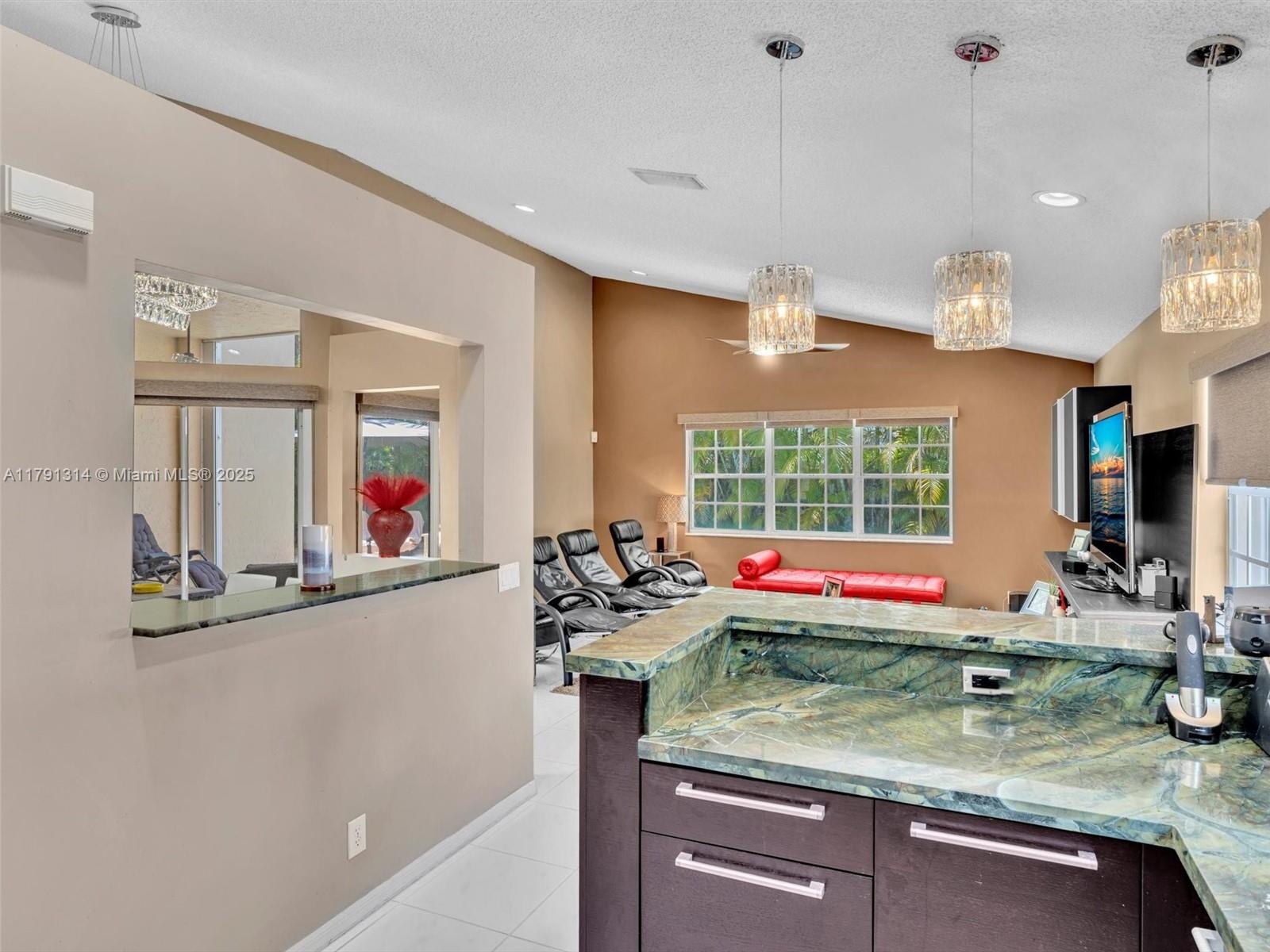 Spacious open plan filled with natural light. The kitchen, which overlooks the pool, features granite countertops and stainless steel appliances.