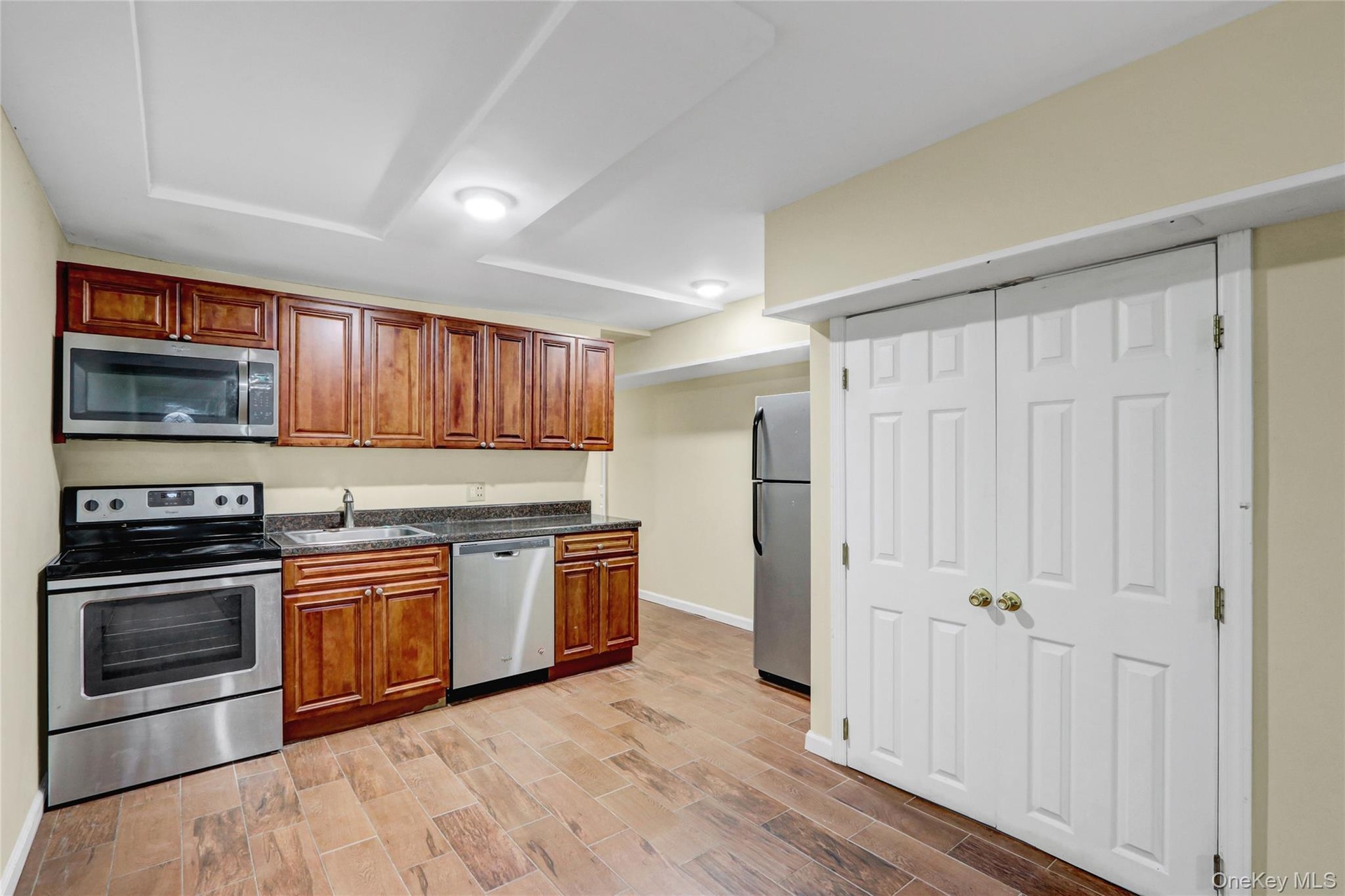 - Kitchen featuring stainless steel appliances, a sink, light wood finished floors, baseboards, and brown cabinetry