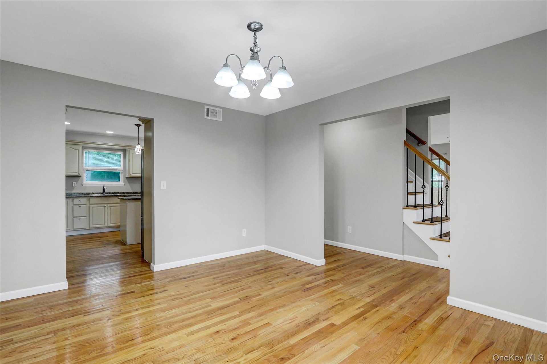 - Unfurnished room featuring light wood-type flooring, a chandelier, stairway, and baseboards