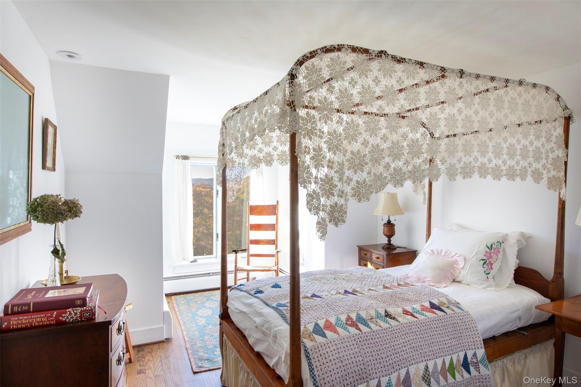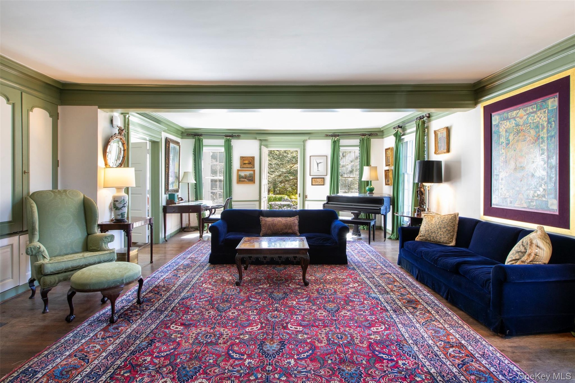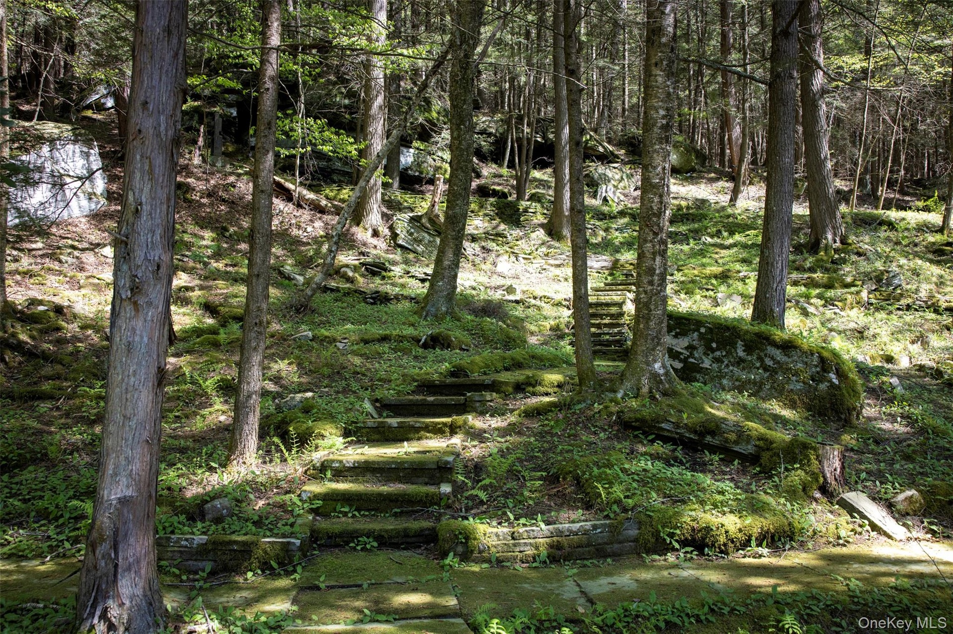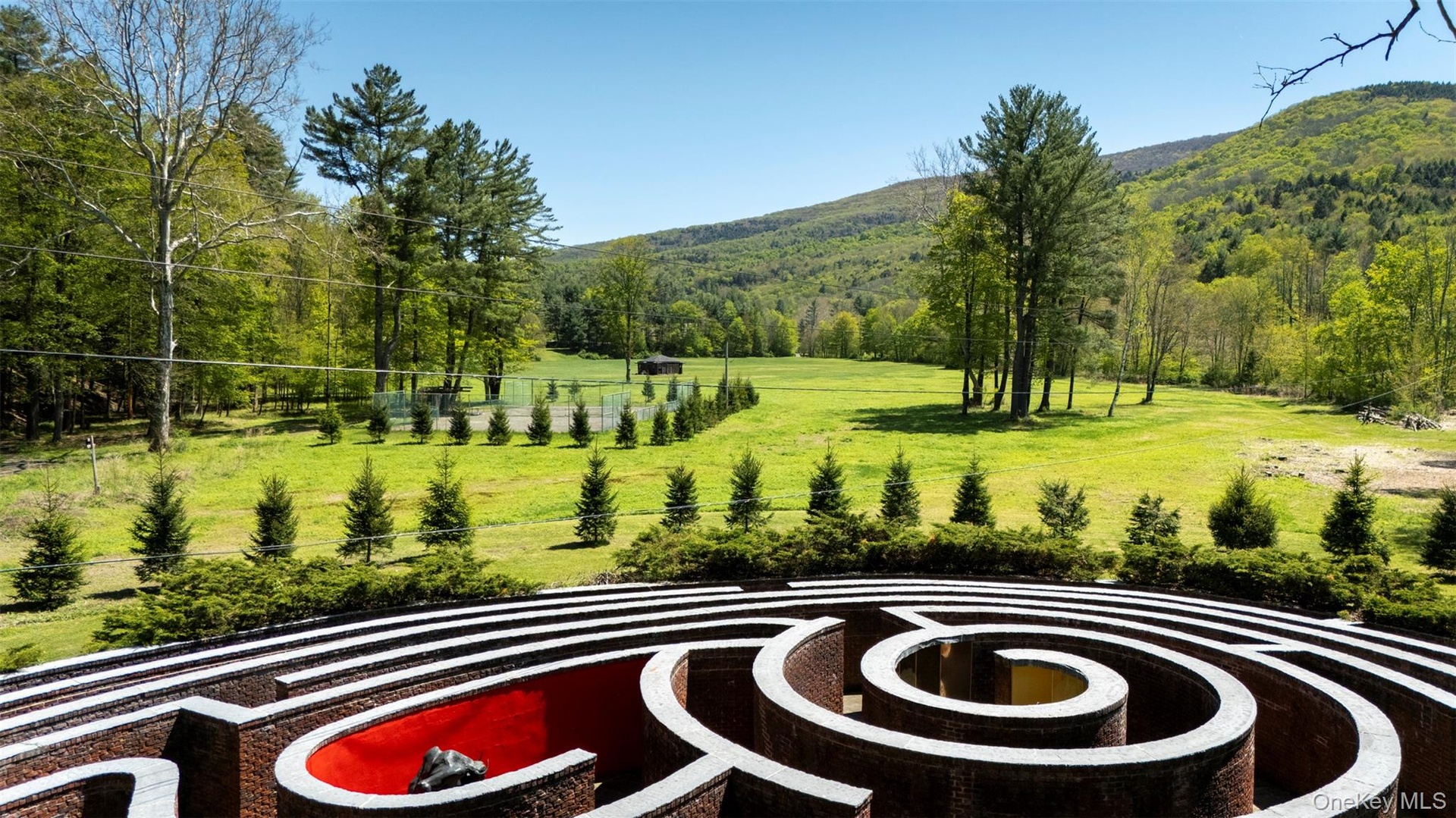 The architectural centerpiece is a fully renovated 5,300-square-foot colonial-style residence, renovated in 2016 for modern mountain living. With eight bedrooms, seven and a half baths, expansive decks and patios, and a meditative cupola, the home offers commanding views over formal gardens, wide lawns, and the surrounding forested hills. Moss-lined bluestone paths and a covered cedar staircase lead from a semi-circular pond to a beautifully restored 2,800-square-foot brick guest house with three private apartments, perfect for guests, staff, or continued use as a creative retreat.