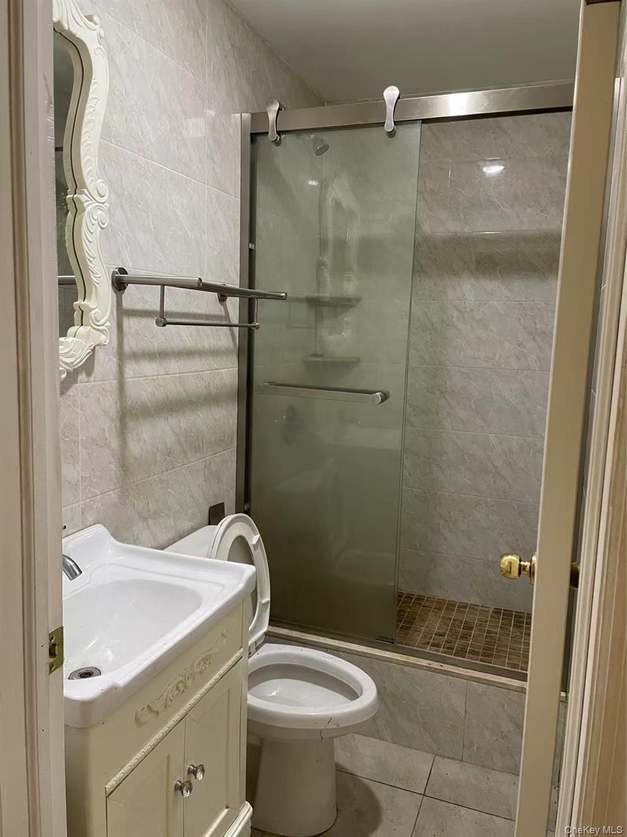 - Full bath featuring tile walls, a stall shower, vanity, toilet, and tile patterned flooring