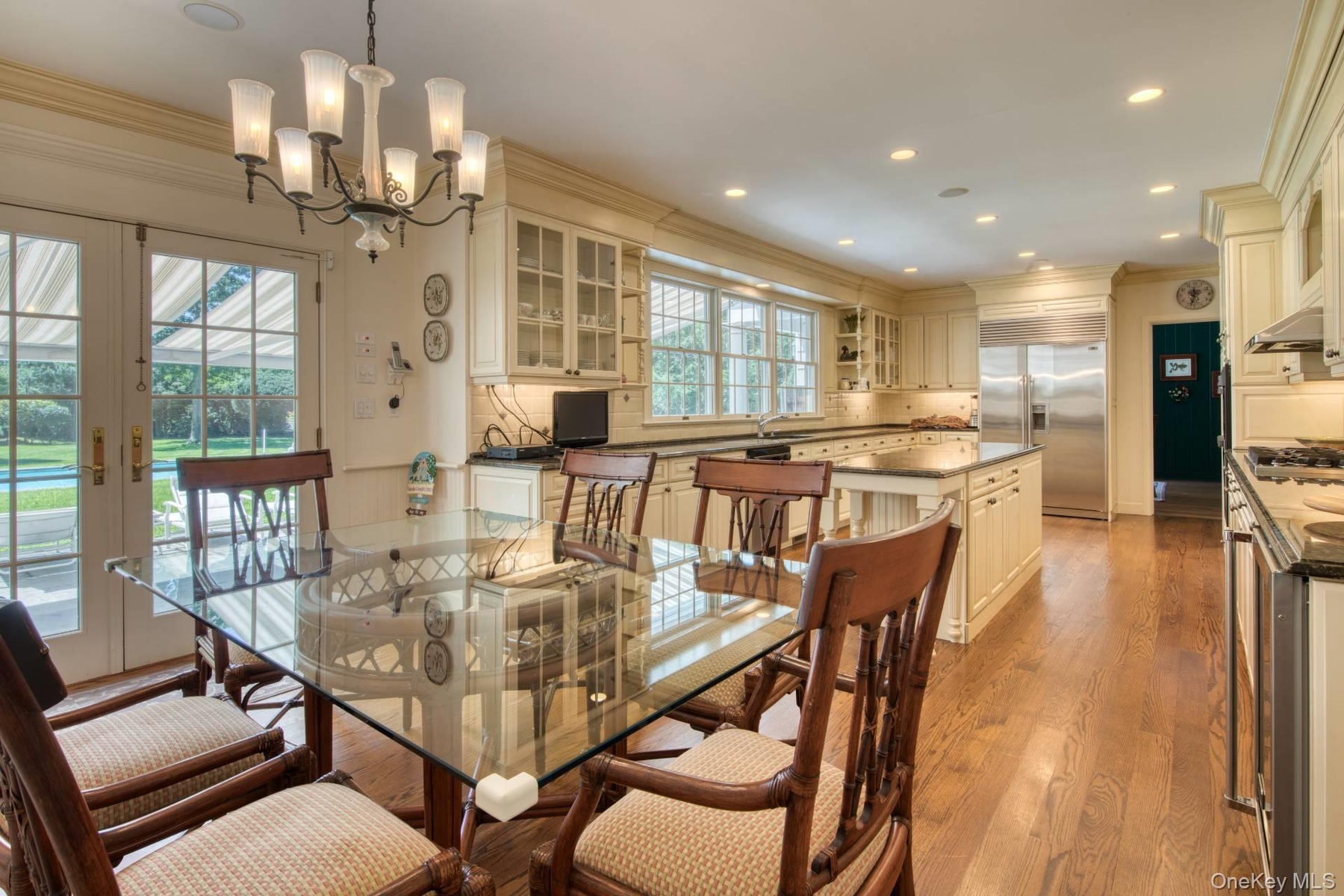 - Dining area featuring ornamental molding, light wood finished floors, a chandelier, and recessed lighting
