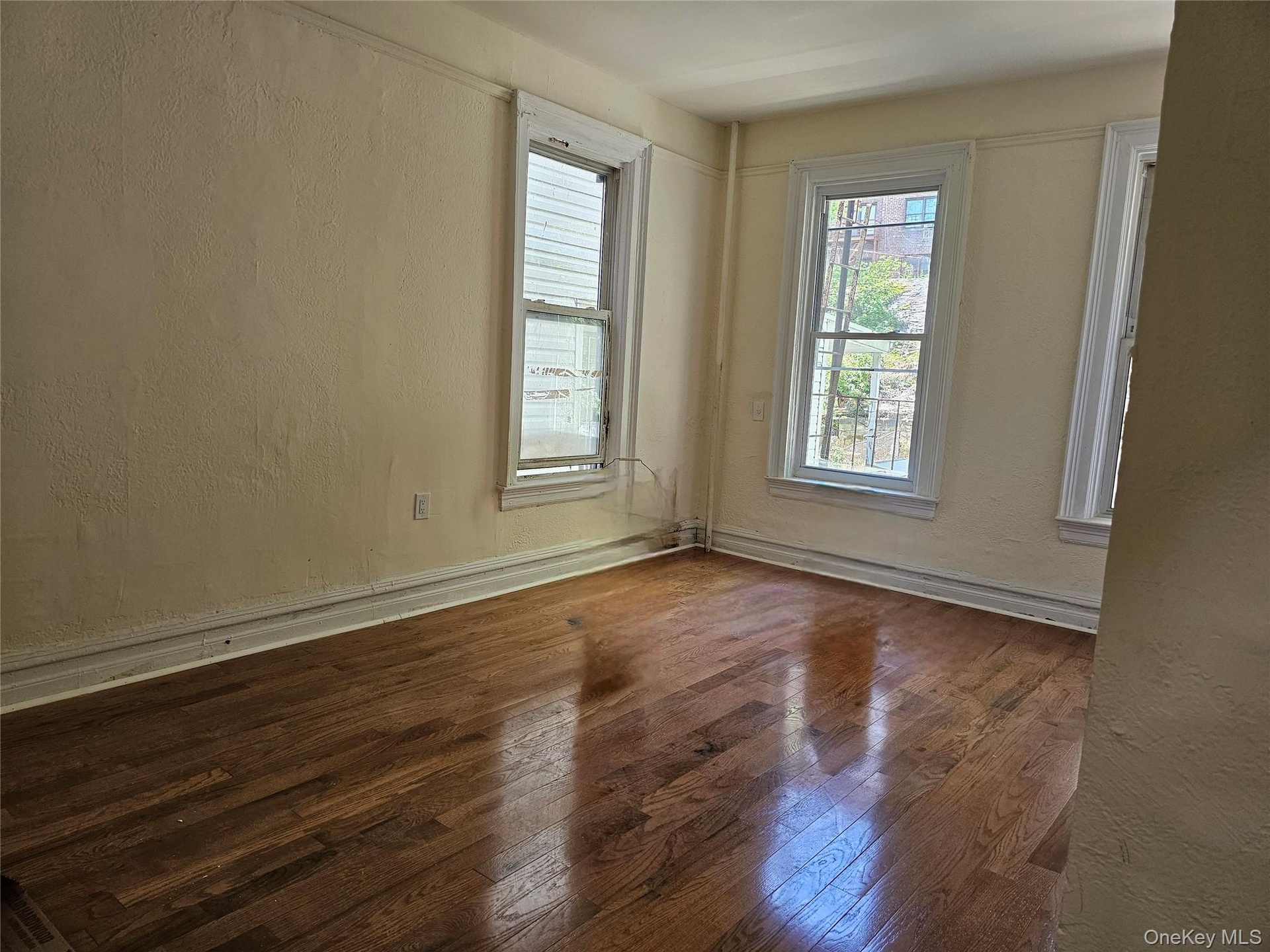 - Unfurnished room with radiator heating unit, wood finished floors, and baseboards