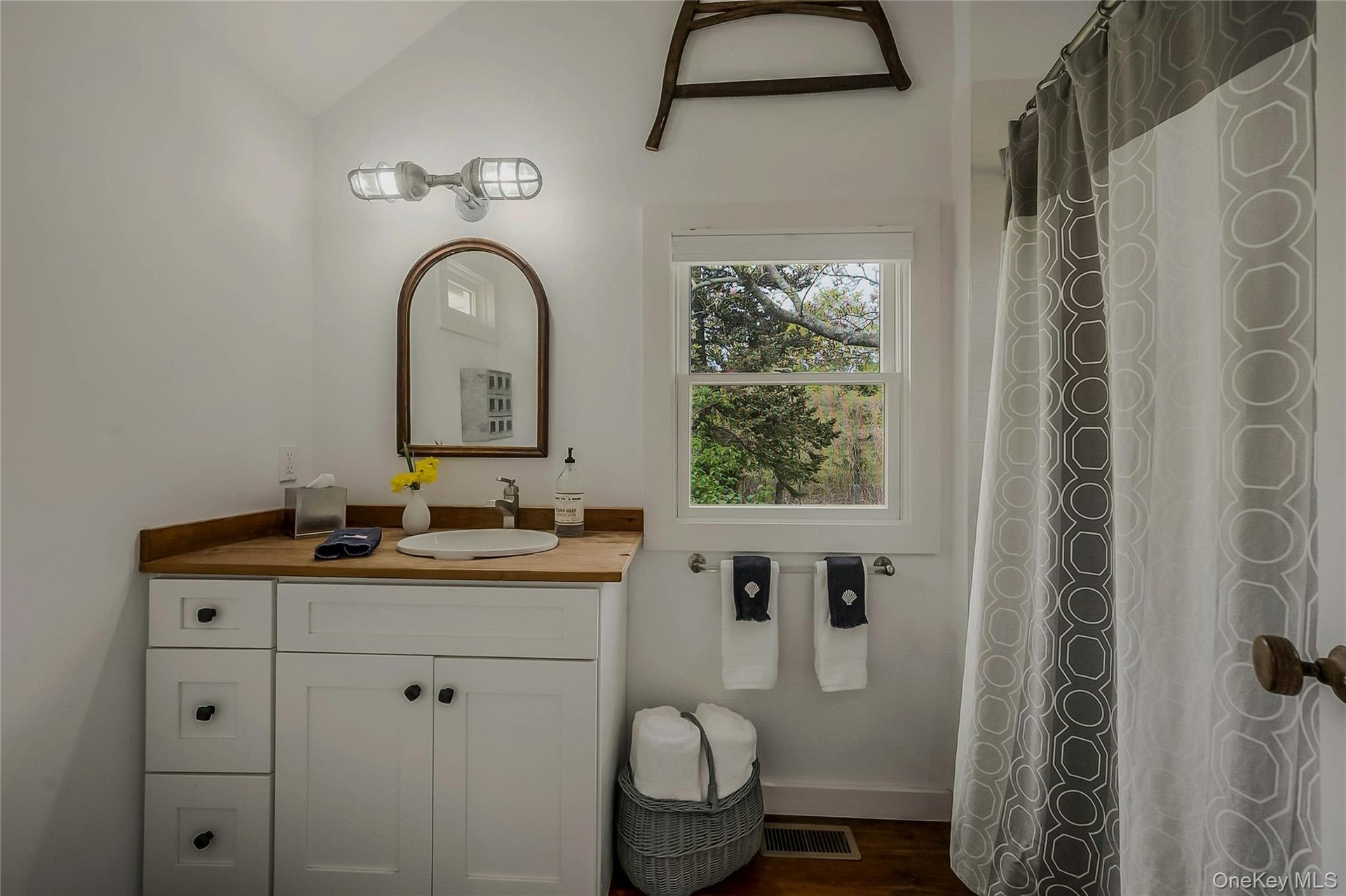- Full bath with vanity, vaulted ceiling, and wood finished floors
