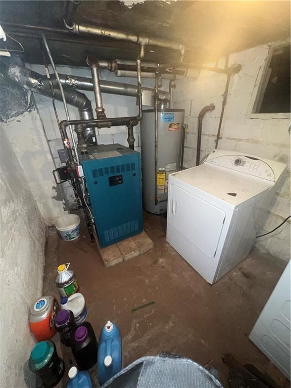 - Laundry area with washer / dryer, gas water heater, and a heating unit